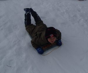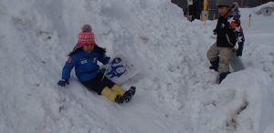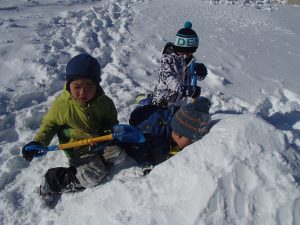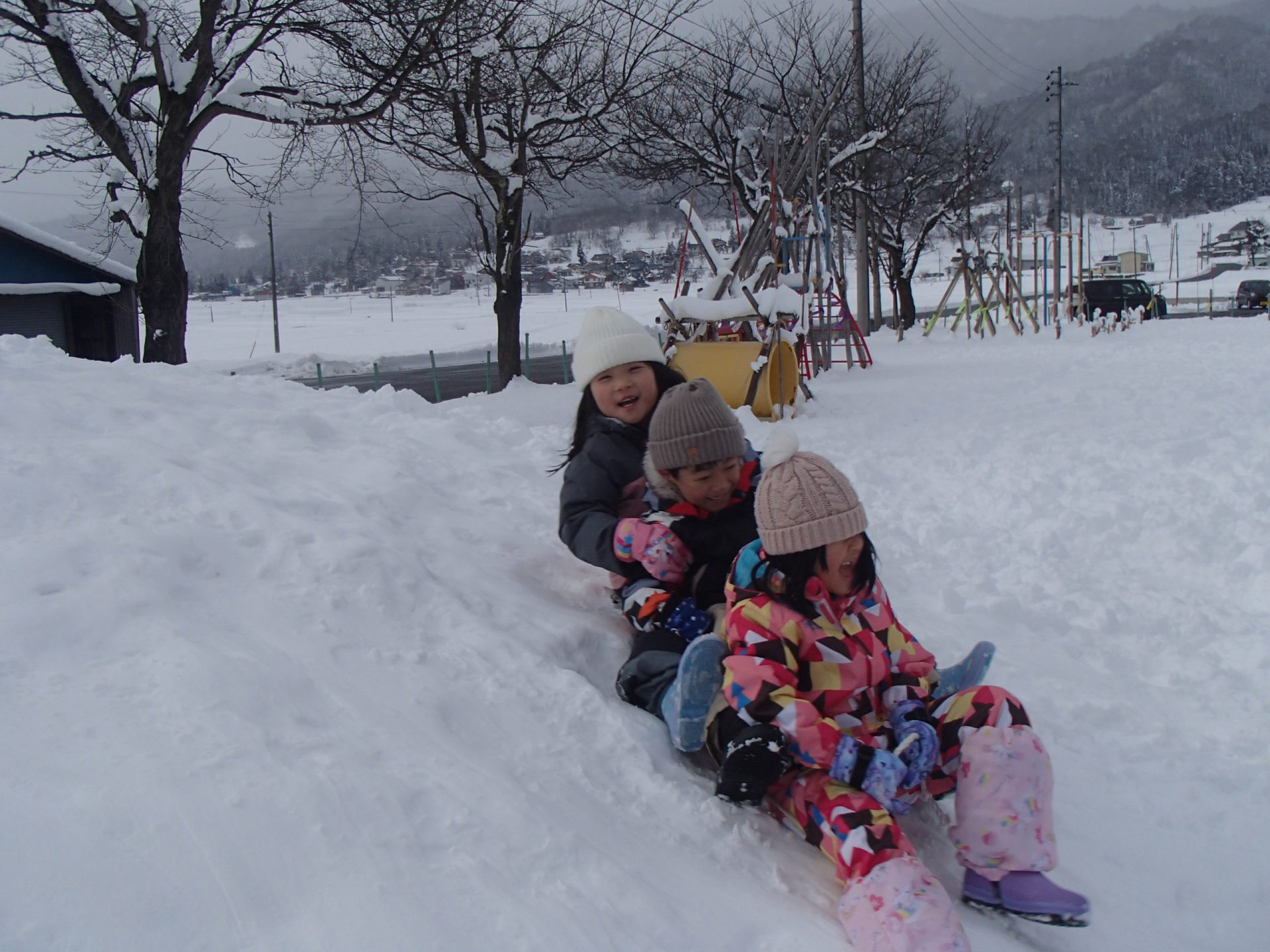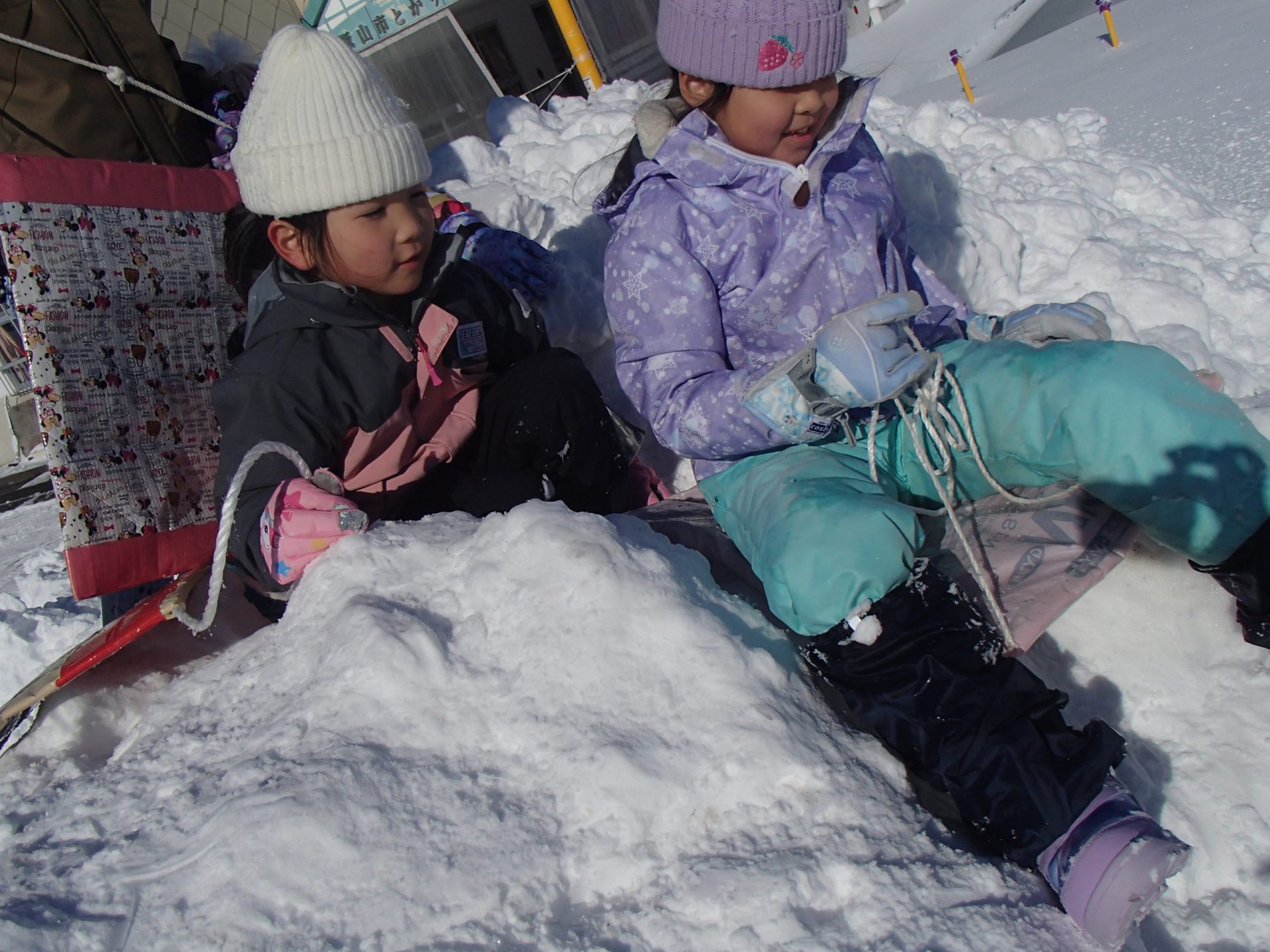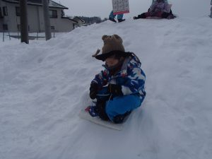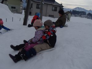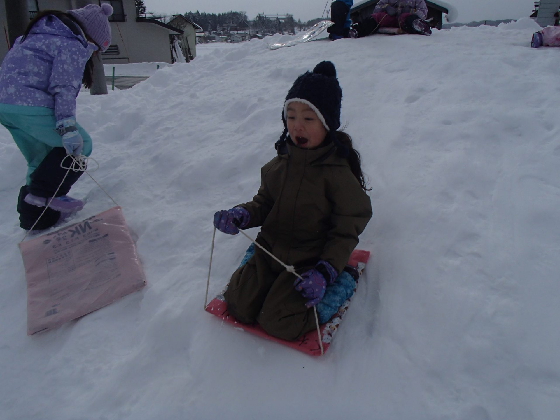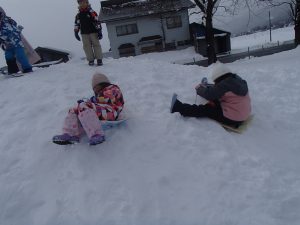 雪質によって、そりもよく滑ったり、なかなか滑らなかったりするので、「今日はよく滑るね」「よく滑るように何回も滑ろう」と言いながらそりコースを楽しそうに作る姿もありました。