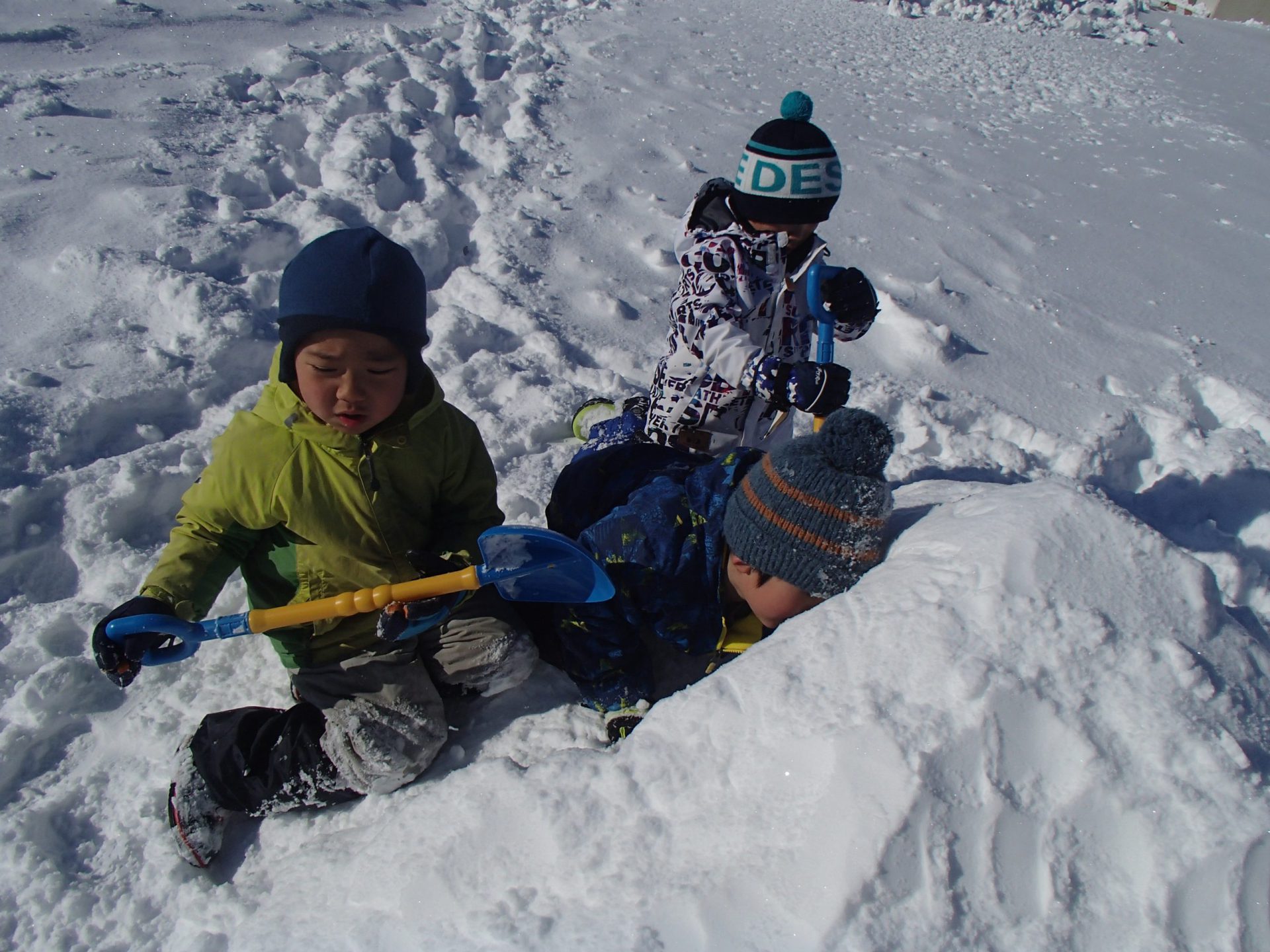 「こっちも掘ろうよ」と、相談しながらかまくらづくりをしていました。