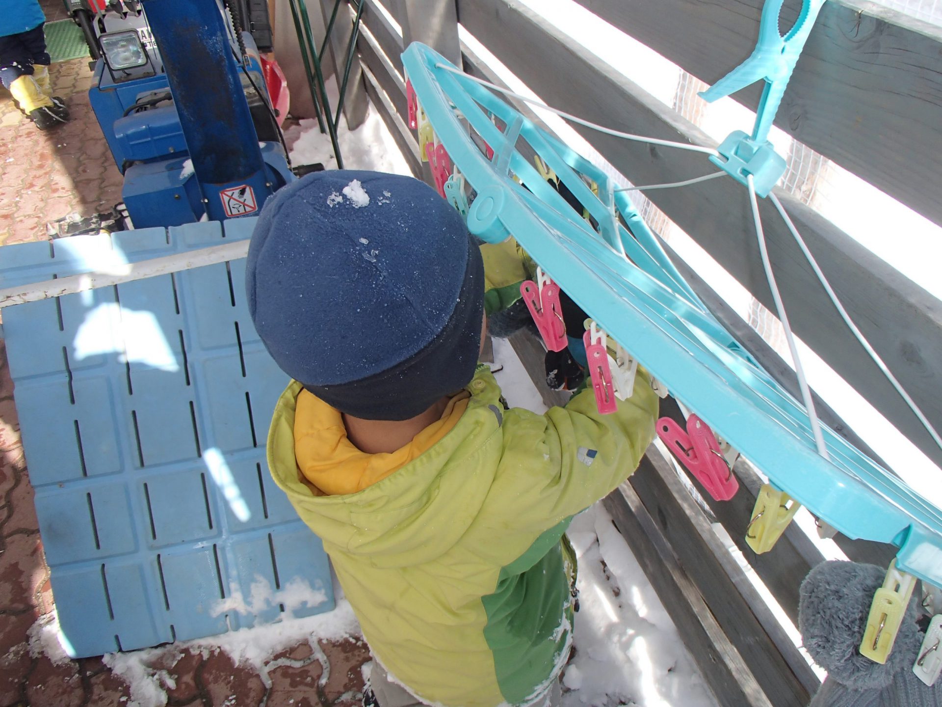 雪遊びのあとは、手袋を干してしっかり雪を払ってお部屋へと戻ります。