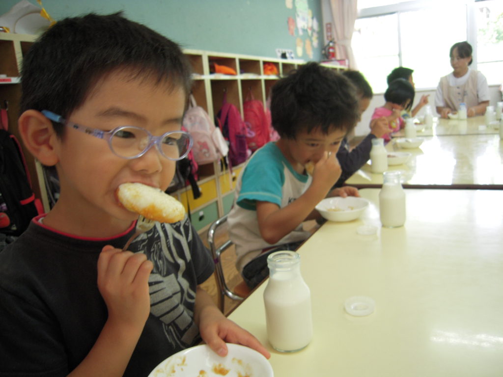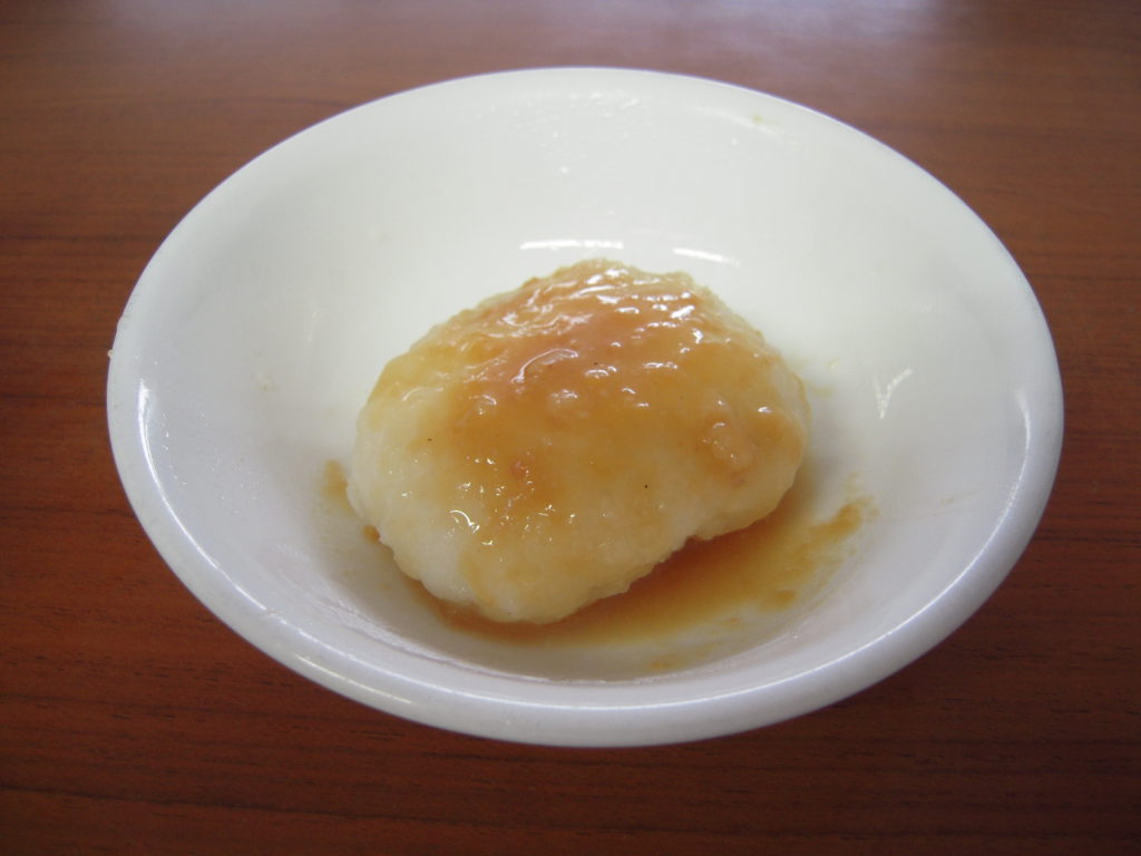 昔は家庭でよくごはんが残ったときにおやつとして、ごはんに小麦粉を混ぜてこね、油を敷いたフライパンで焼いたものにみそと砂糖を混ぜたタレをかけて食べられていたようですが、最近は作る家庭も減っており、子どもたちもあまり馴染みがないようですが、おやつに出ると大人気!