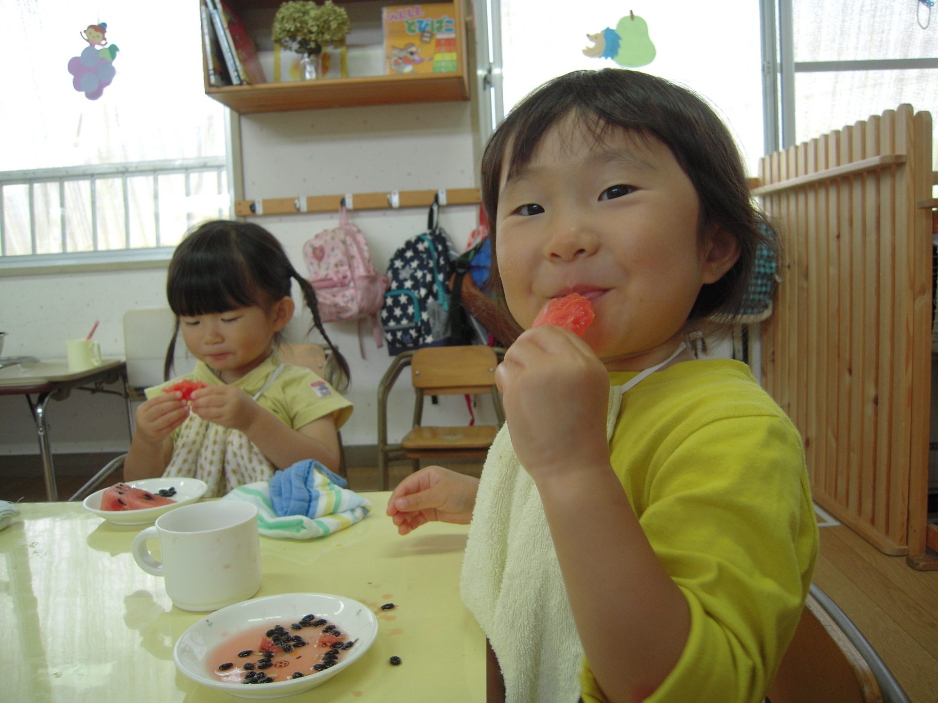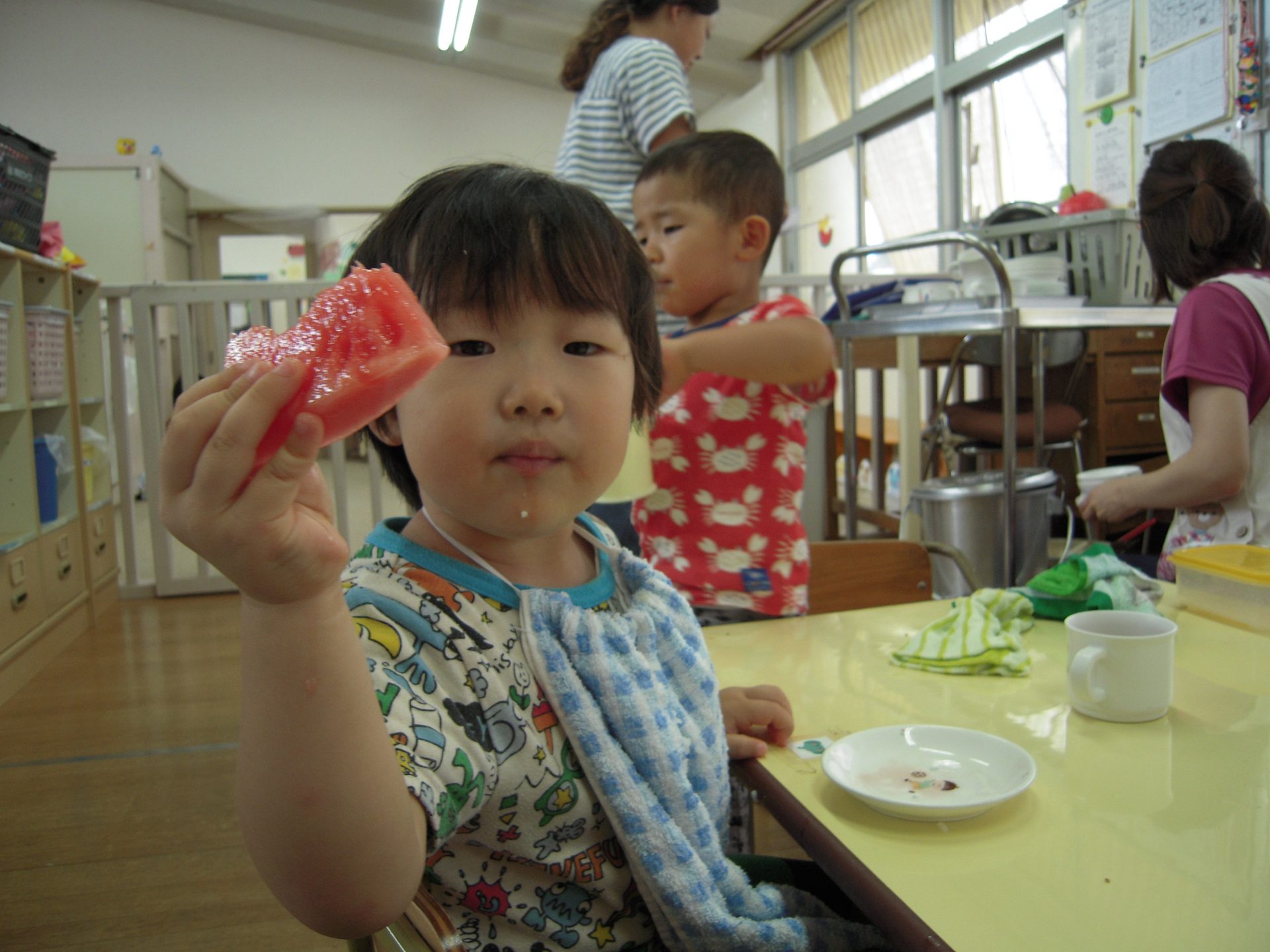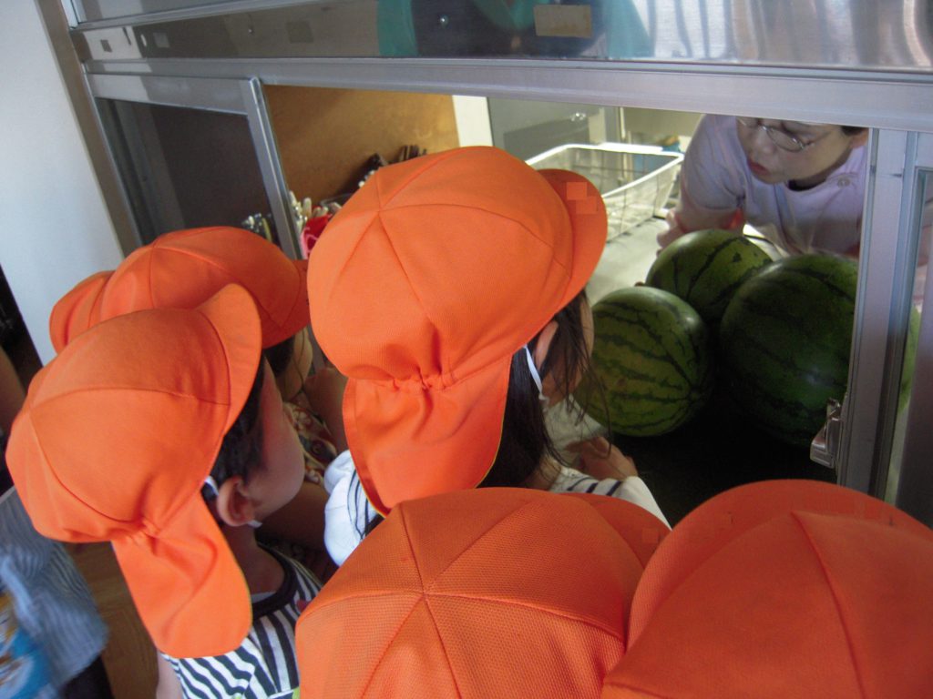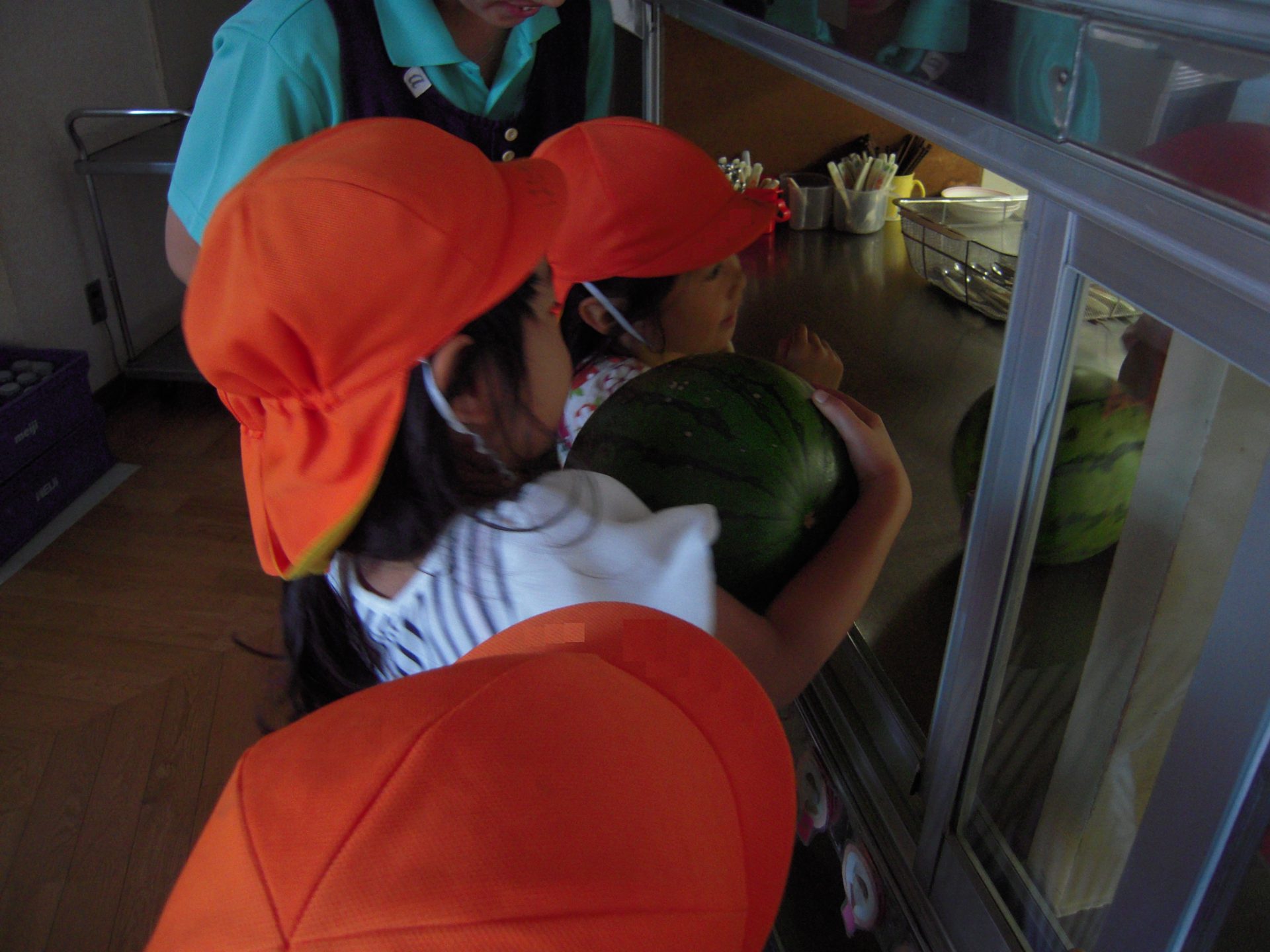 この日、夏の間年長児が畑で育てていたスイカが最後の収穫の日を迎え、お昼の給食の時間にみんなでいただきました。