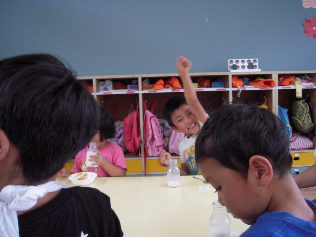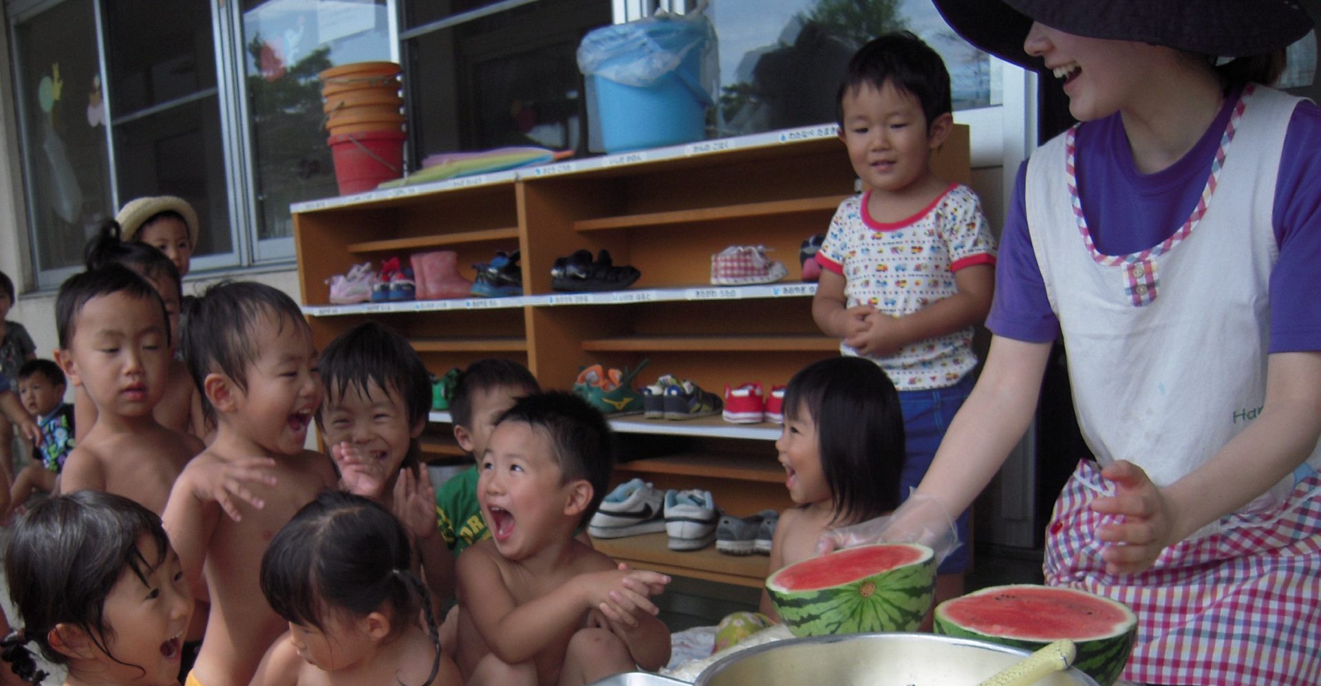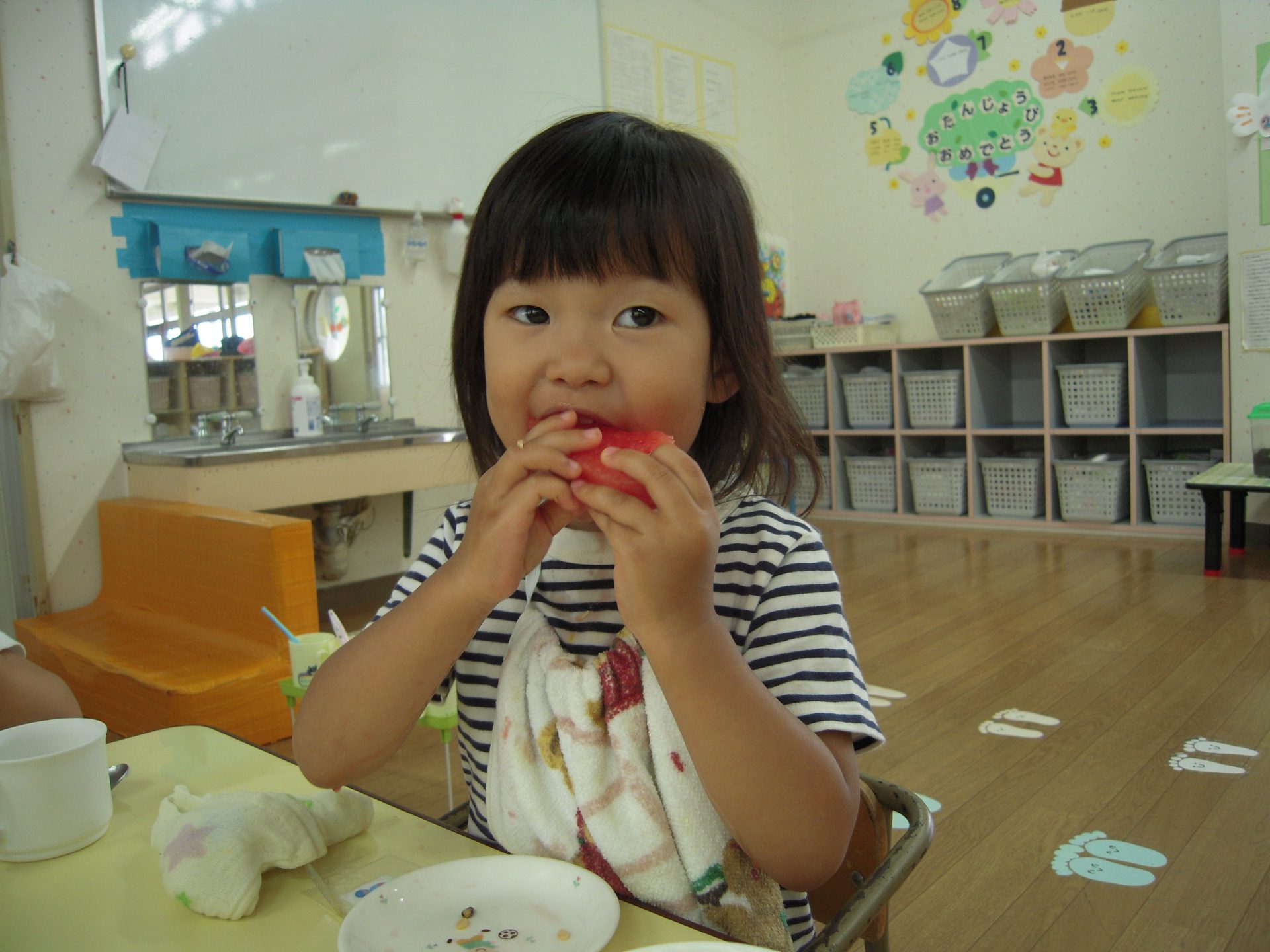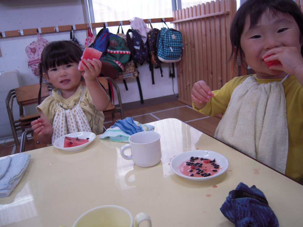 この日、夏の間年長児が畑で育てていたスイカが最後の収穫の日を迎え、お昼の給食の時間にみんなでいただきました。