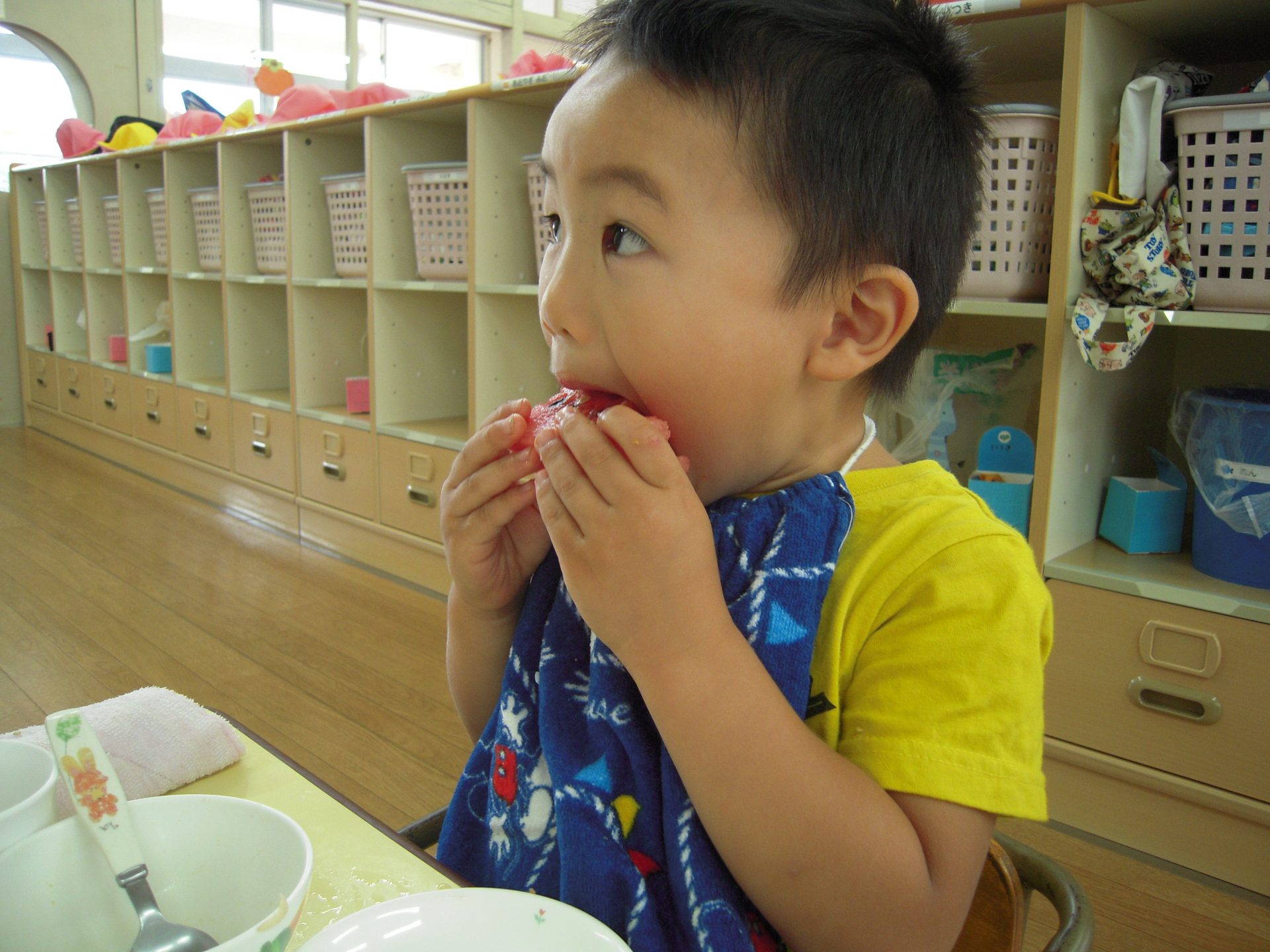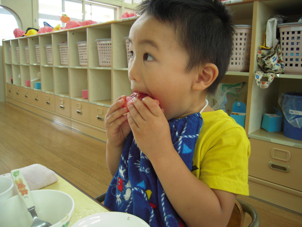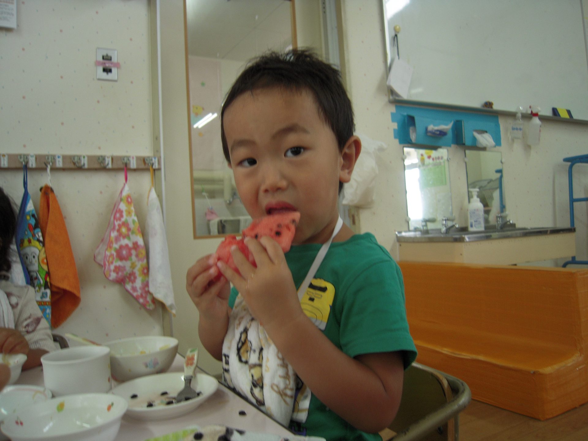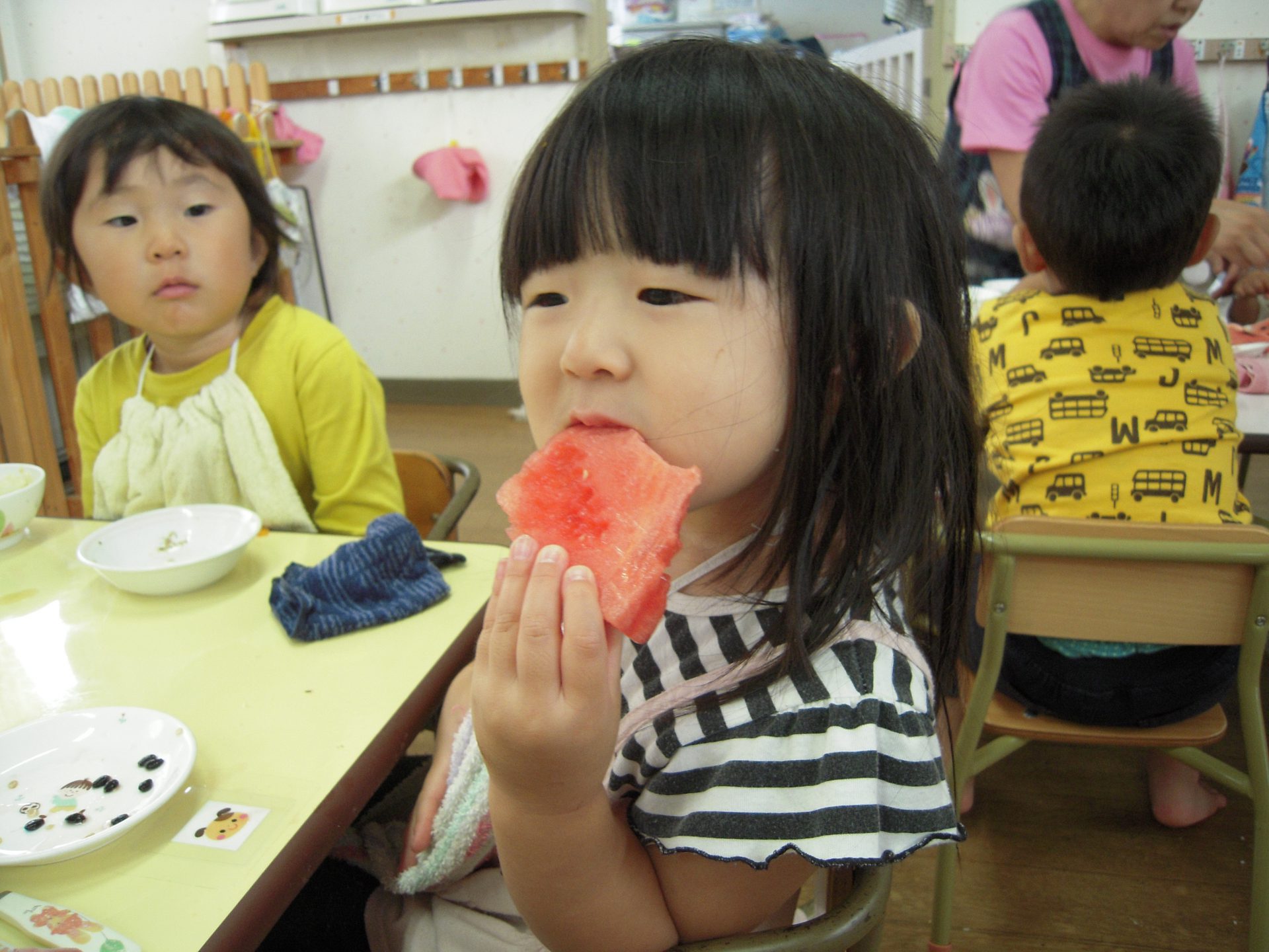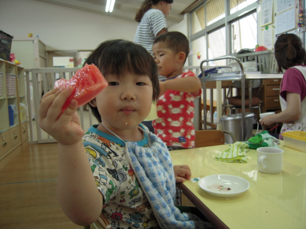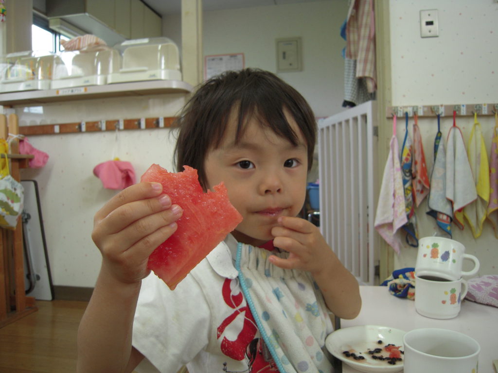 大きな切れ目のスイカに、今日のデザートはスイカだー!ととても喜んでいた2歳児さん。