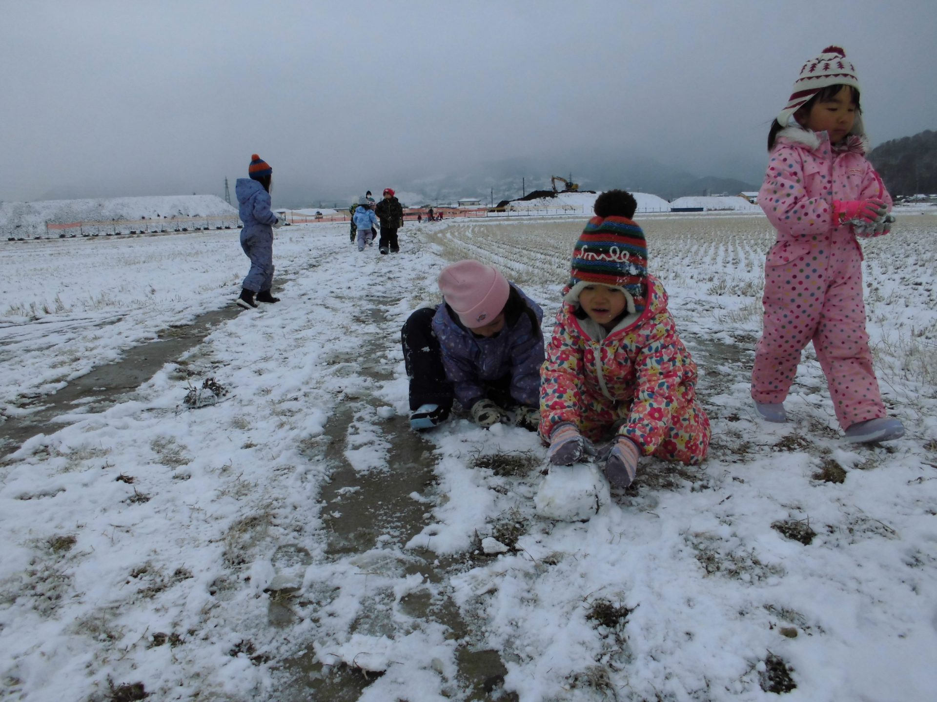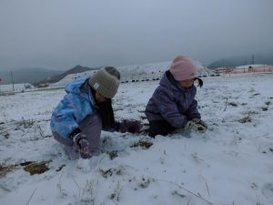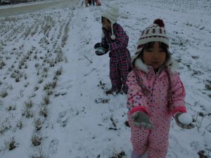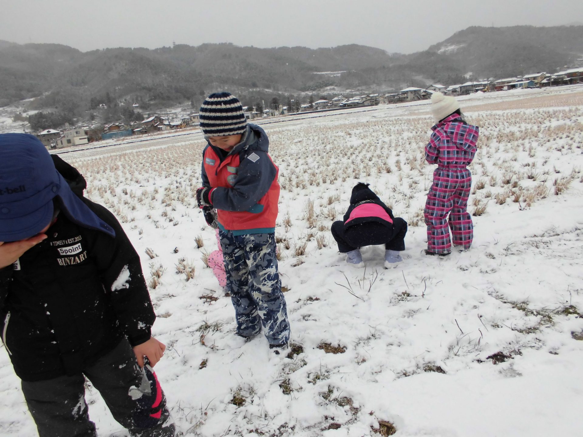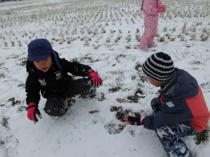 雪が溶けてグチャグチャになってしまった園庭から、あぜ道に移動してきました。