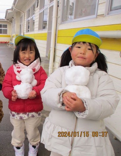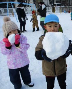 雪玉や雪だるまを作りました。「こんなに大きいのできたよ!」と嬉しそうです。出来上がった雪だるまは、赤ちゃんを抱っこするように、大事に抱えていました。