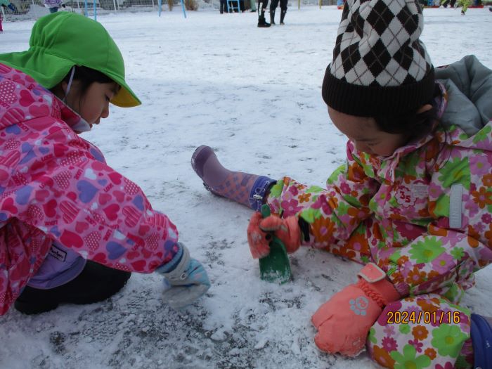 ・雪や氷に触れて遊ぶことを通して、その冷たさや性質に気付けるような機会を設けていきたいと思います。また、園庭の中でどこが凍りやすいか、氷を溶かすにはどうしたら良いかなど、考えられるように言葉を掛けていきたいです。