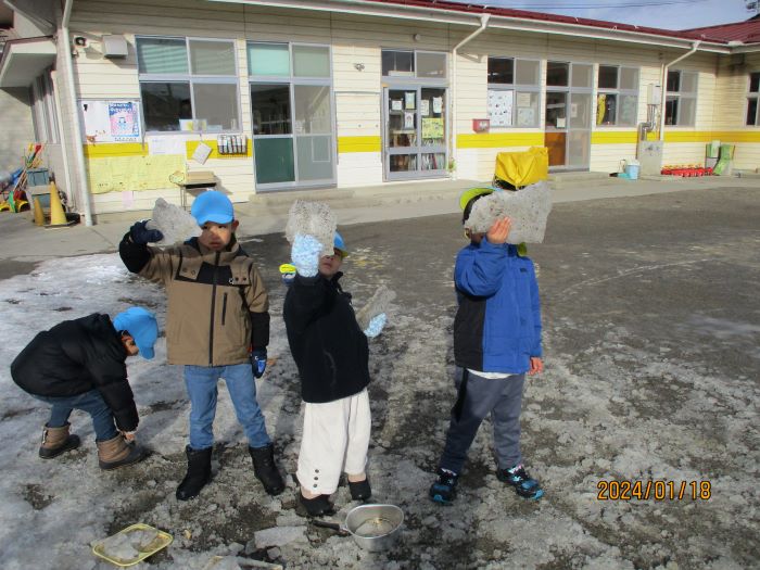 雪や氷で、冬ならではの遊びを楽しんでいる子ども達です。