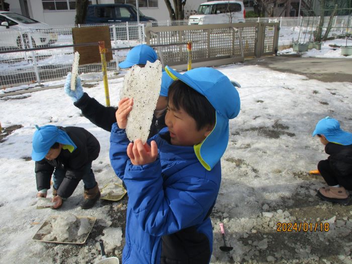 ・シャベルで氷を削ることから化石の発掘へとイメージを広げて遊んでいました。