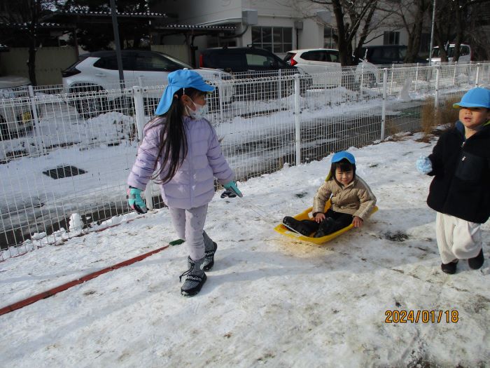 そり遊びも大好きです。友達を乗せて引っ張ったり、自分も引いてもらったりと、交代しながら遊んでいます。