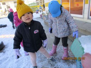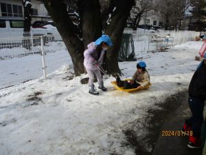 ・雪遊びを通して友達と一緒に雪玉を作ったり、そりを交代で引き合ったりなど、関わって遊ぶ姿がたくさん見られました。子ども達がどんなやりとりをしているのか、どんな遊びの世界を共有しているのかじっくりと見守っていきたいです。
