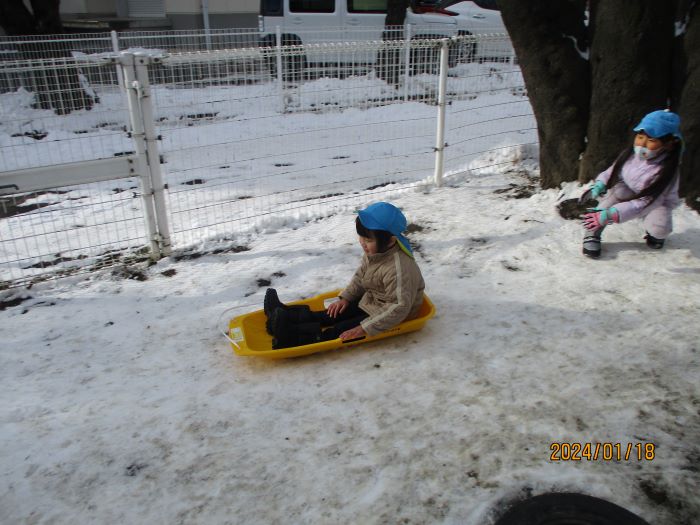 園庭の隅に少し傾斜があることに気づき、そりを滑らせていました。
