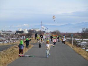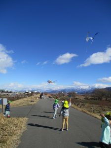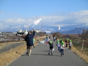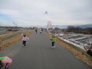 ・寒い中でも楽しく体を動かし、戸外で遊び体が温まる感覚を知ってほしいと思い、戸外で遊ぶ機会を毎日つくっています。走ることが大好きな子どもたちですが、風があると走らなくても凧が揚がることに気がつきました。凧揚げを通して風を感じることができました。お天気の日は嬉しいですが、強風もたまにはいいですね♪