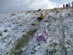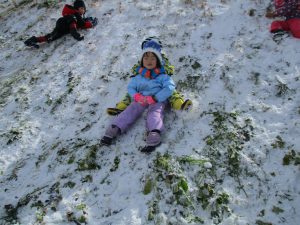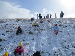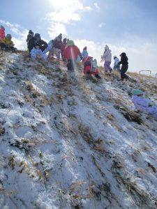 真島保育園の自慢の遊び場、千曲川沿いの土手で冬ならではのお楽しみの遊びを紹介します。