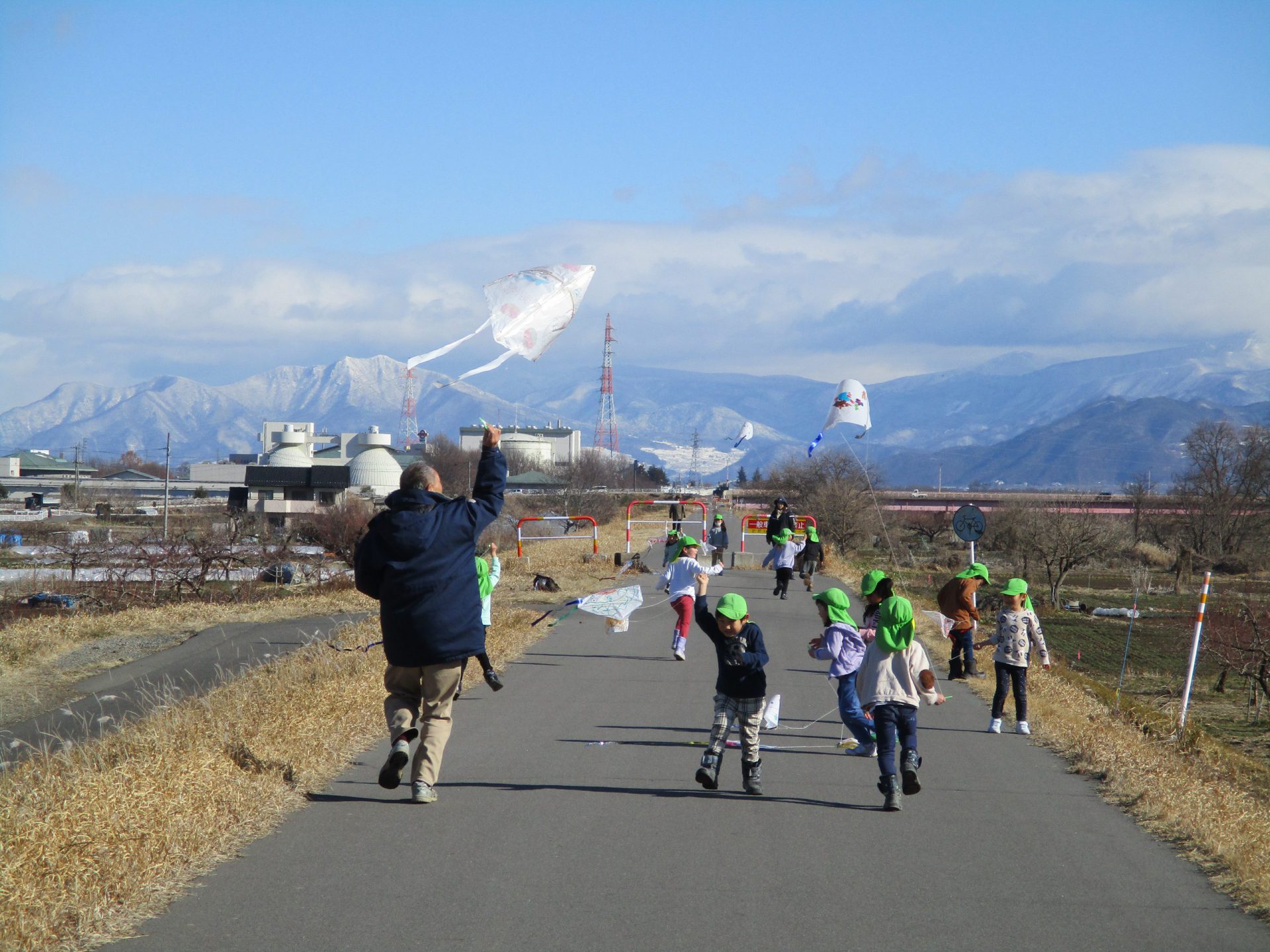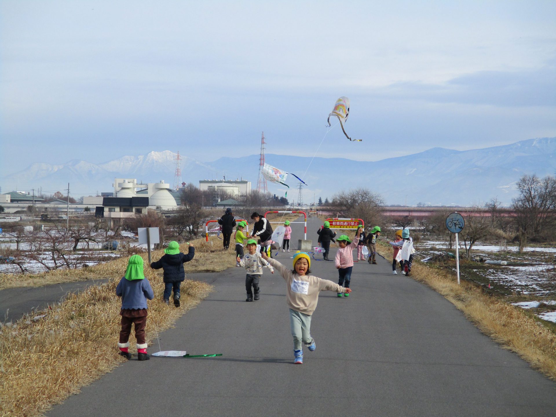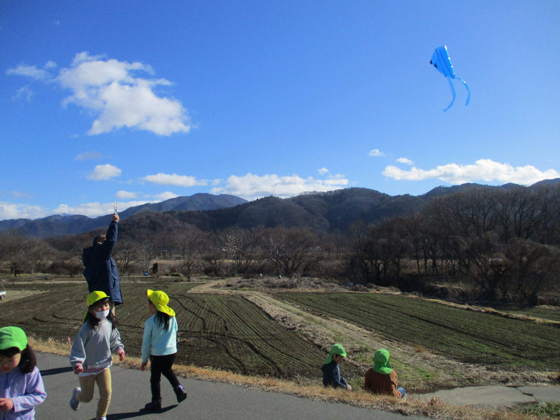 この日は、園長先生も散歩についてきてもらい、一緒に『凧揚げ』をしました。