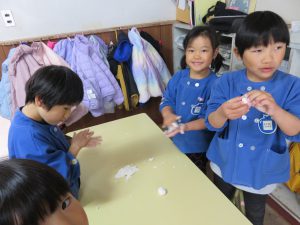 まゆ玉作りではしっかり五感を使い楽しみながら作っていました。