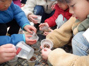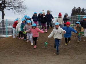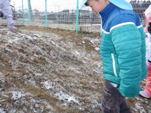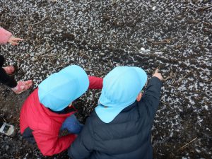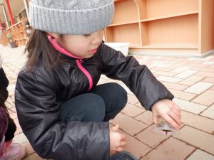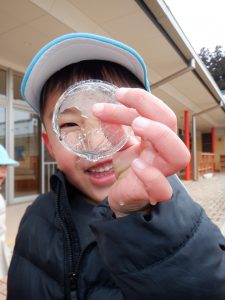 1月になり、朝は気温が氷点下になることが増え戸外で遊ぶと「霜柱見つけた!」「今日は氷になってる!」「昨日より寒かったからかな?」と子ども達は見たり触ったりしたことで、気温や季節の変化を感じています。寒い日でも戸外に出て、たくさんの自然事象を発見し、触れたり考えたりして楽しく過ごしてほしいなと思います。