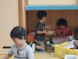教室の隅っこで、お父さん、お母さんになって、おままごとをしていました。