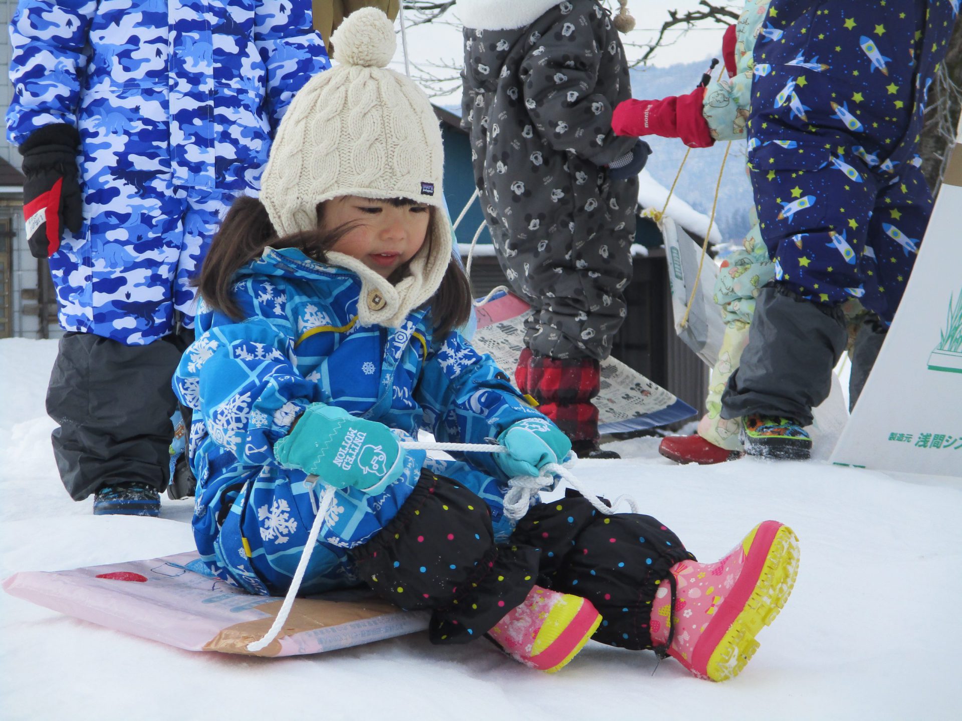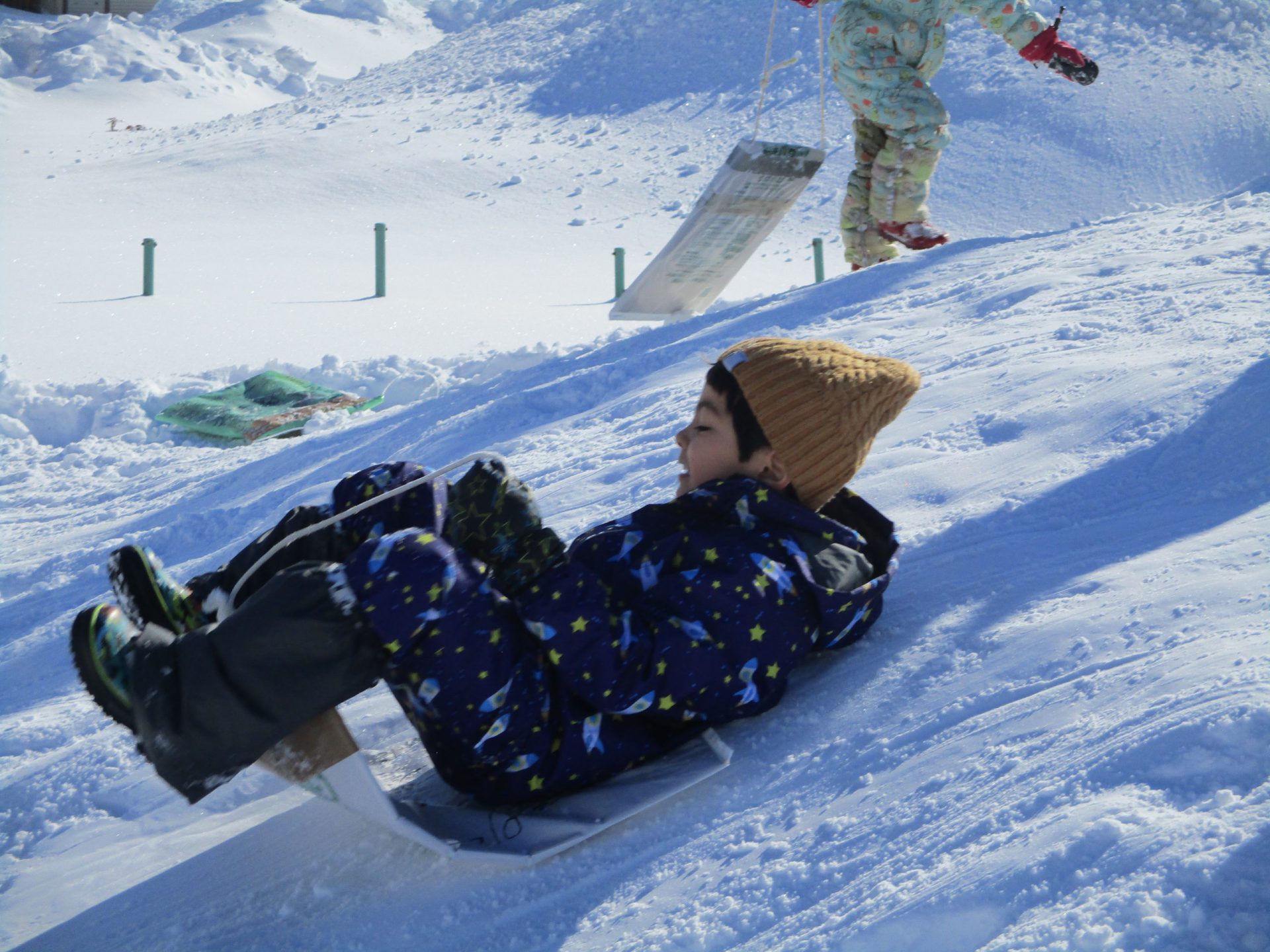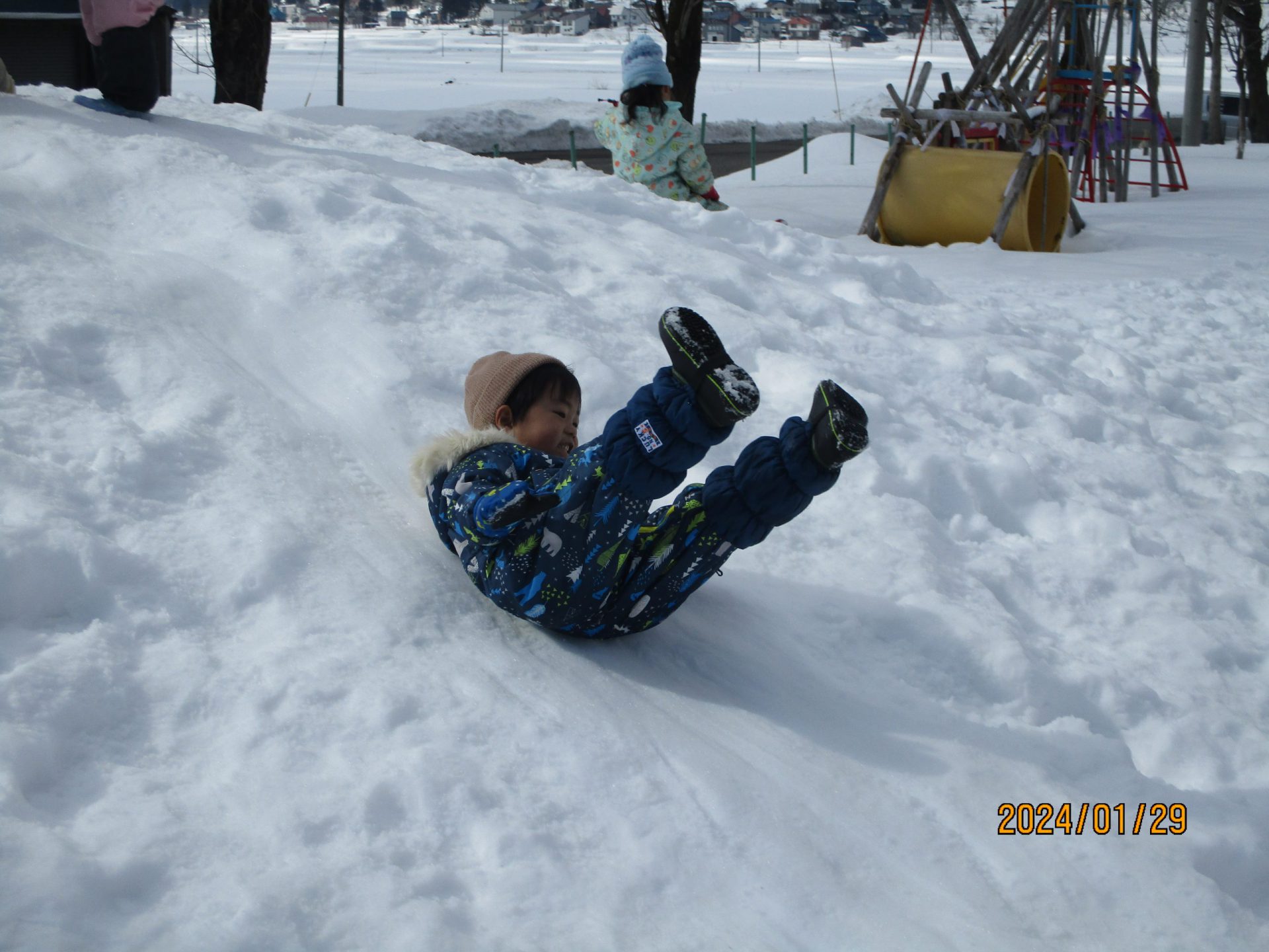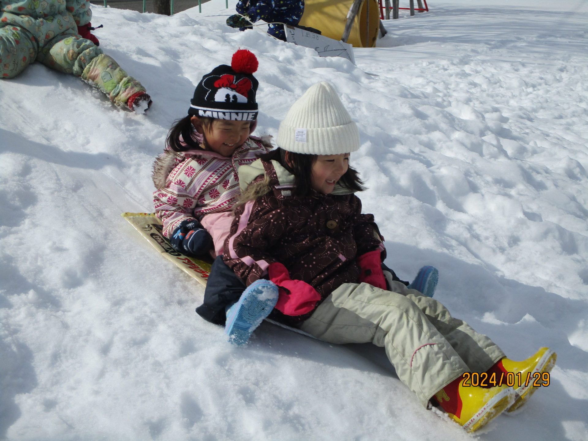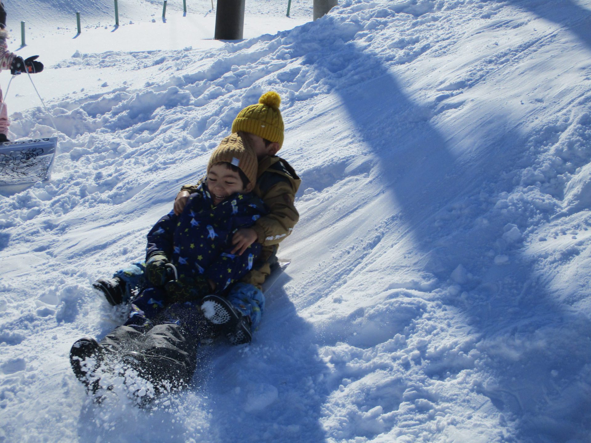 雪山から年中児さん年長児さんが作ってくれた雪山コースをお尻や、お家の方が作ってくださった手作りソリで滑り降りることを繰り返し楽しんでいます。スピードを楽しんだり、友達と連なって滑る楽しさも味わっています。