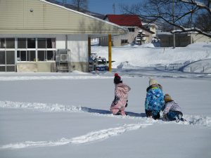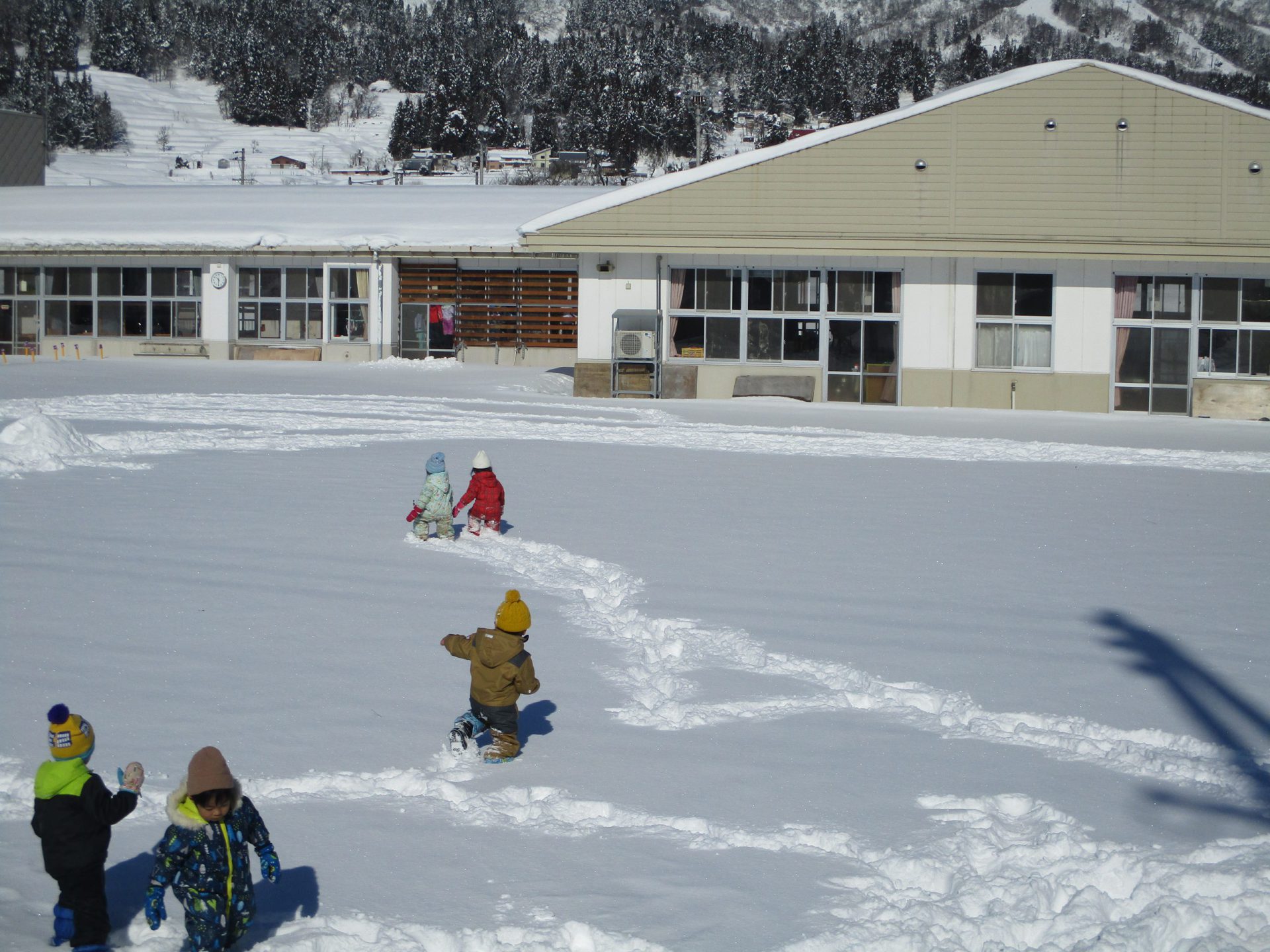 豪雪地帯飯山市の北部に生まれ育つ子どもらしさを大切に、限られた冬季の季節のなかで、十分に身体を使って遊ぶことの楽しさや、自然の不思議さに気づき考えたり、実践したりしていろいろな経験をしてほしいと願い、これからも雪遊びの活動を工夫していきたいと思います。