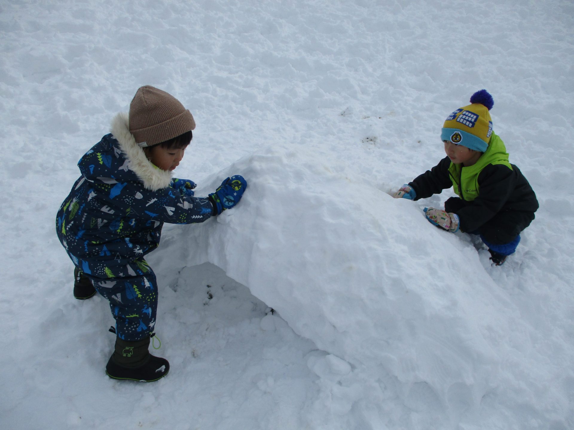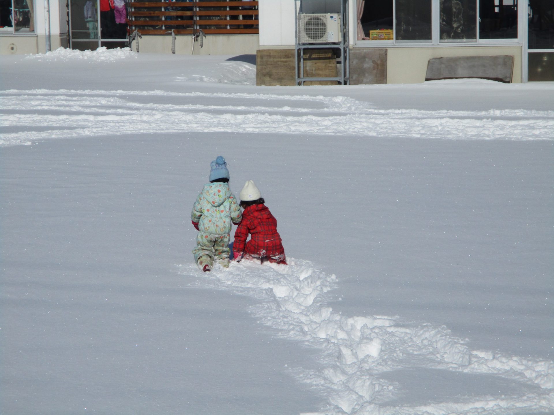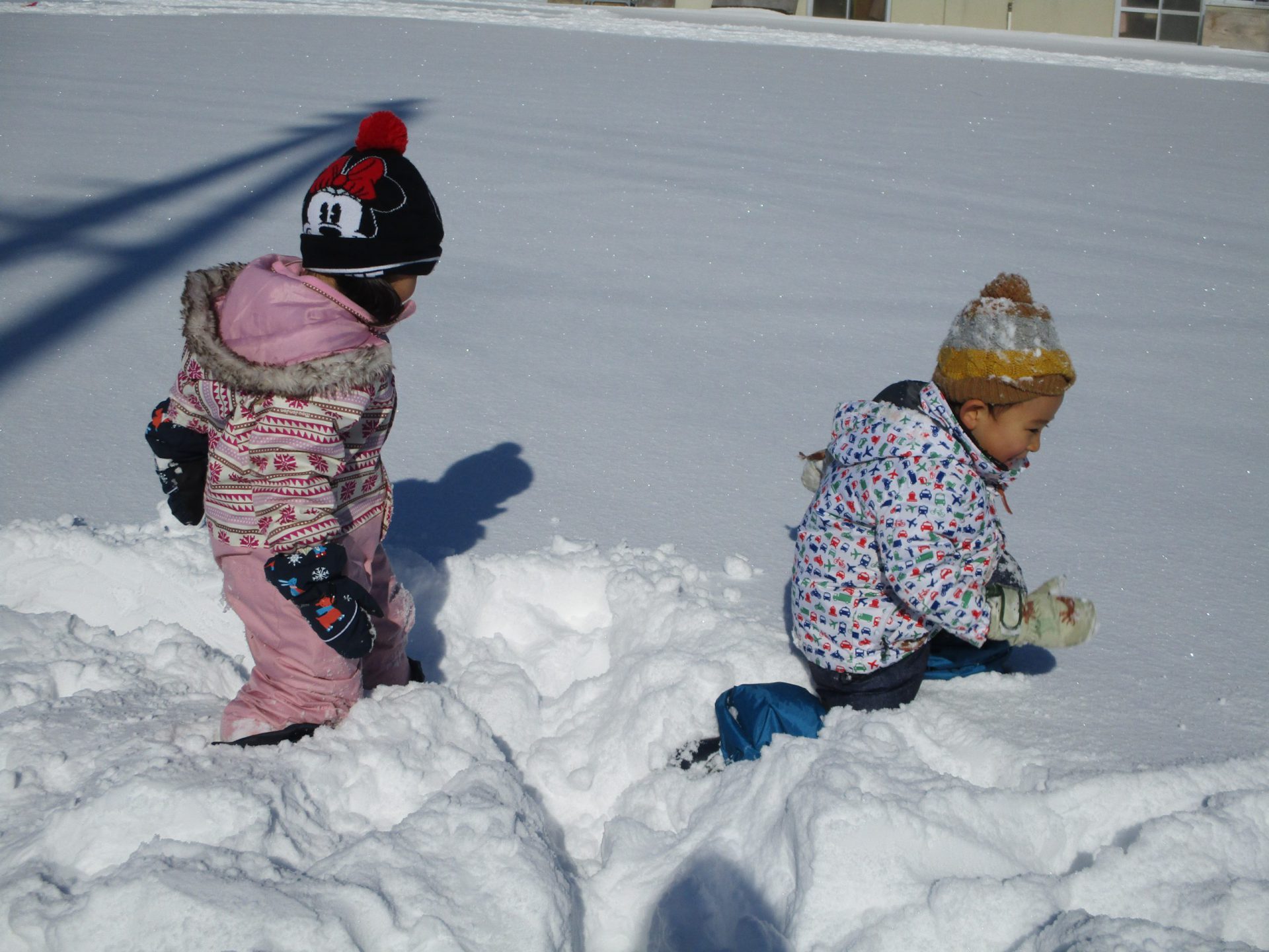 雪上を歩くことにもすっかり慣れて、広い園庭を足が埋まり上手く前に進めずに居る保育士よりも先に、スタスタ足取りよく進んでいく子どもたちです。「せんせい、きょうもゆきあそびしたいね!」登園するなり、雪遊びをして遊びたい気持ちを言葉にして伝えてくれる子どもたち。