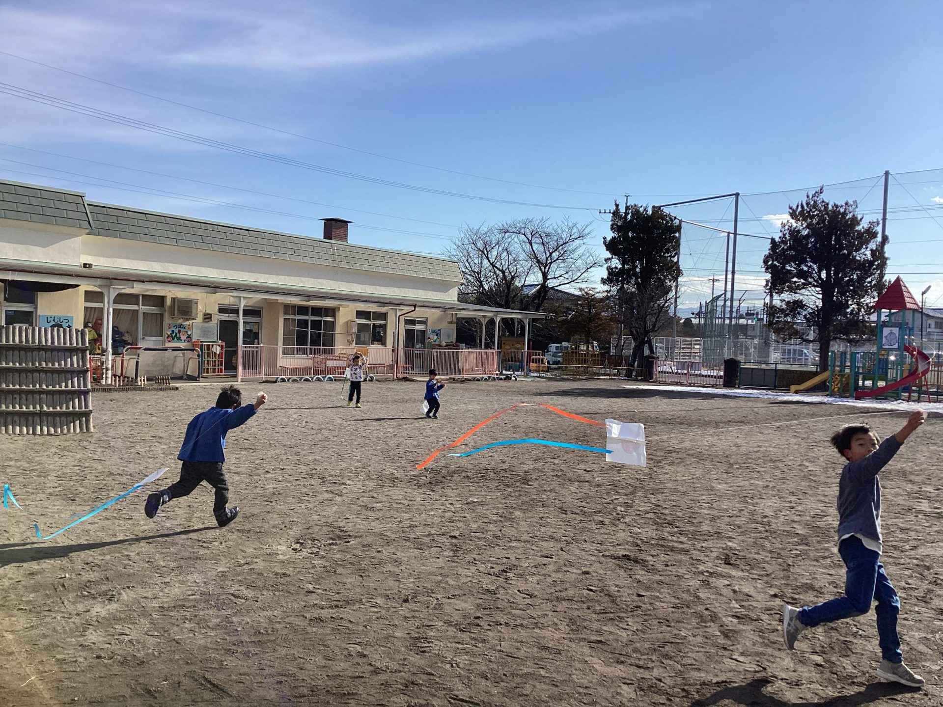 風がない日は子どもたちが思い切り走って風になり、風のある日は風に乗せて・・・楽しそうに遊んでいる様子を見て、他のクラスの子どもたちも「凧やりたい!」「貸して〜!」と集まってきて、順番を交代しながら遊んでいます。