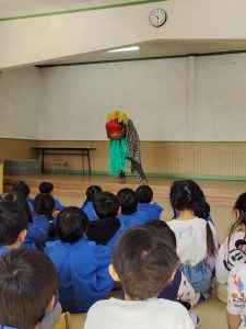 地域の方が来てくださり、お手製の獅子(段ボールやベニヤ板などを組み合わせたもの)で舞を披露してくれました!