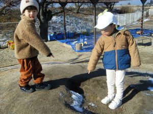 冬の自然事象に気づき、感触や冷たさ、音などの発見を【友だちと】伝えあえた姿が園だからこそできた経験だと感じた。