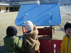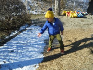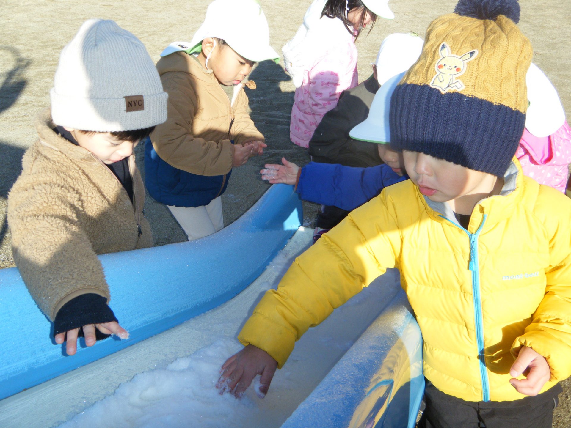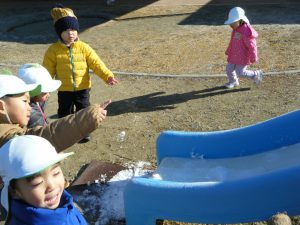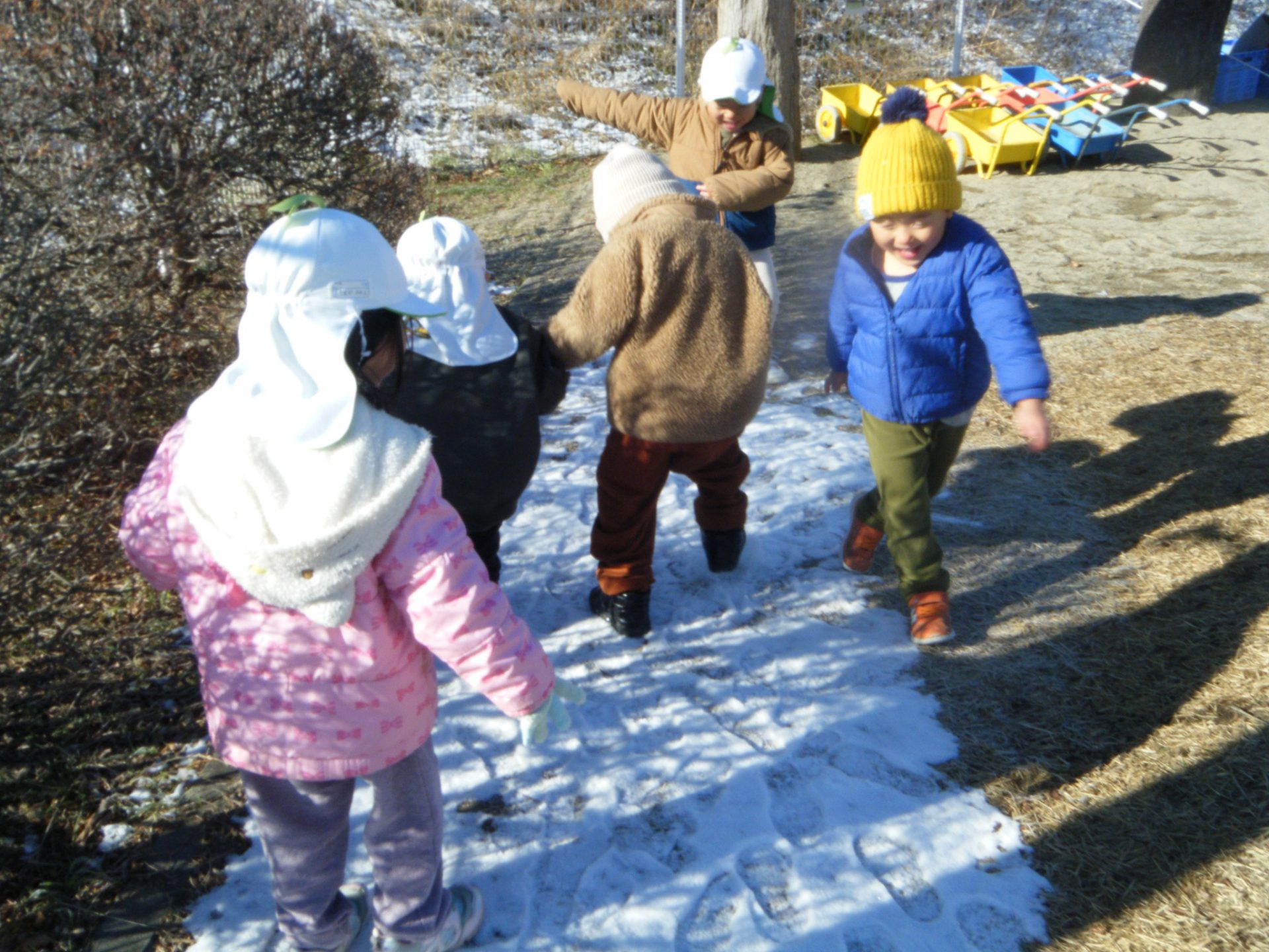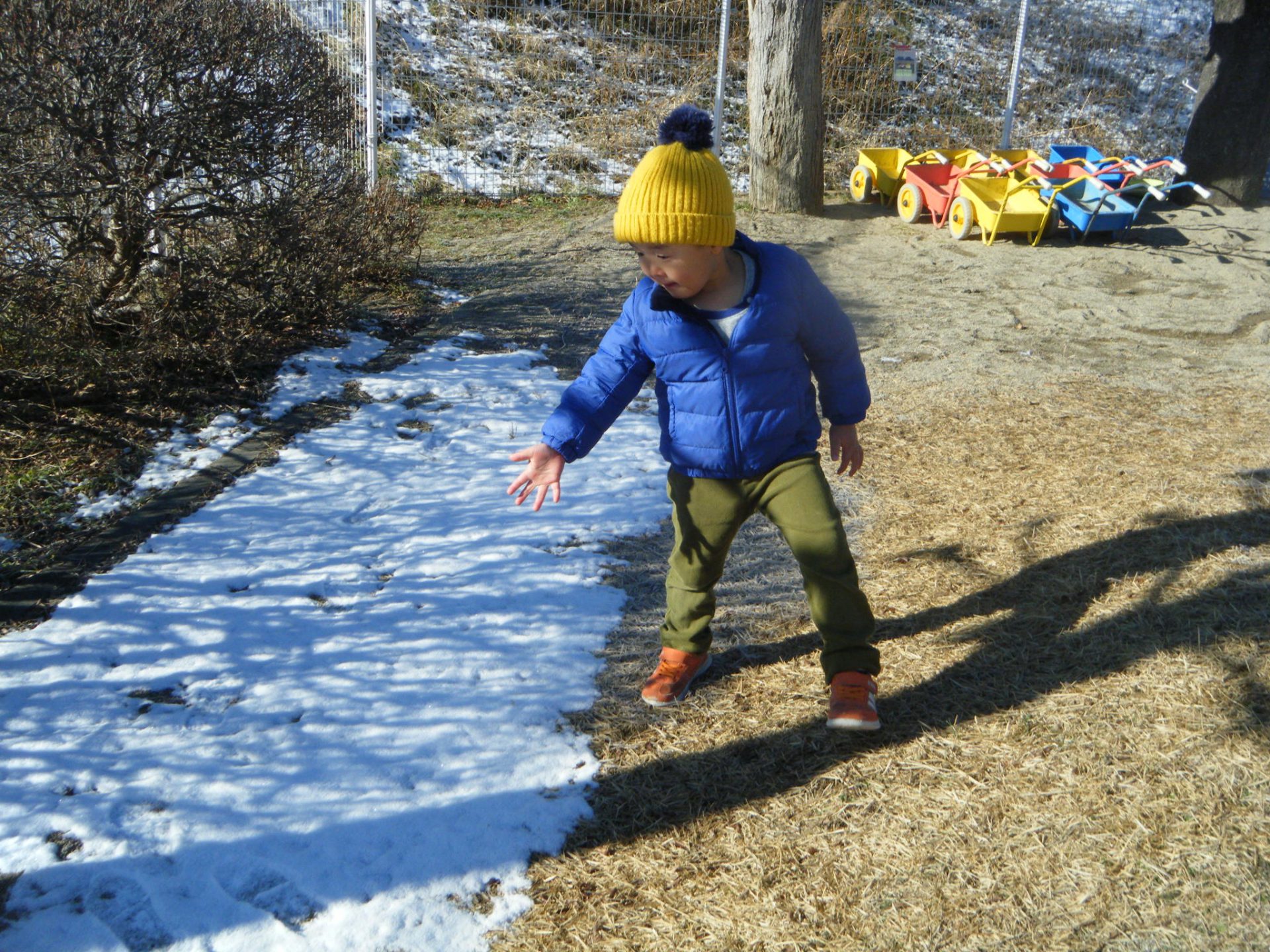 年明け、久しぶりに登園したこども園には残雪がありました。