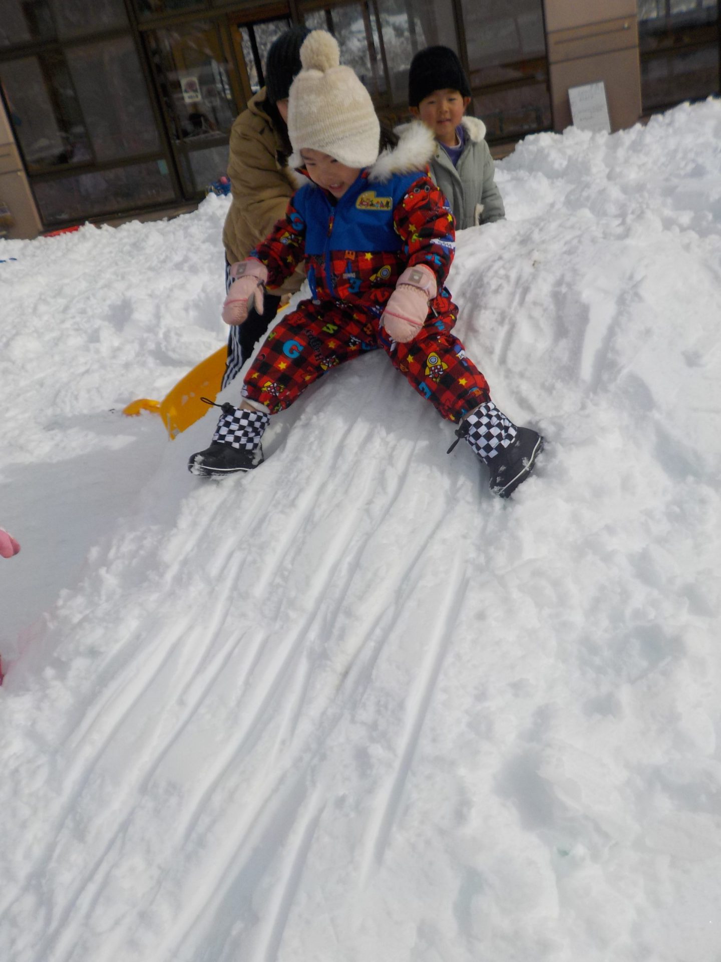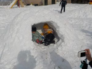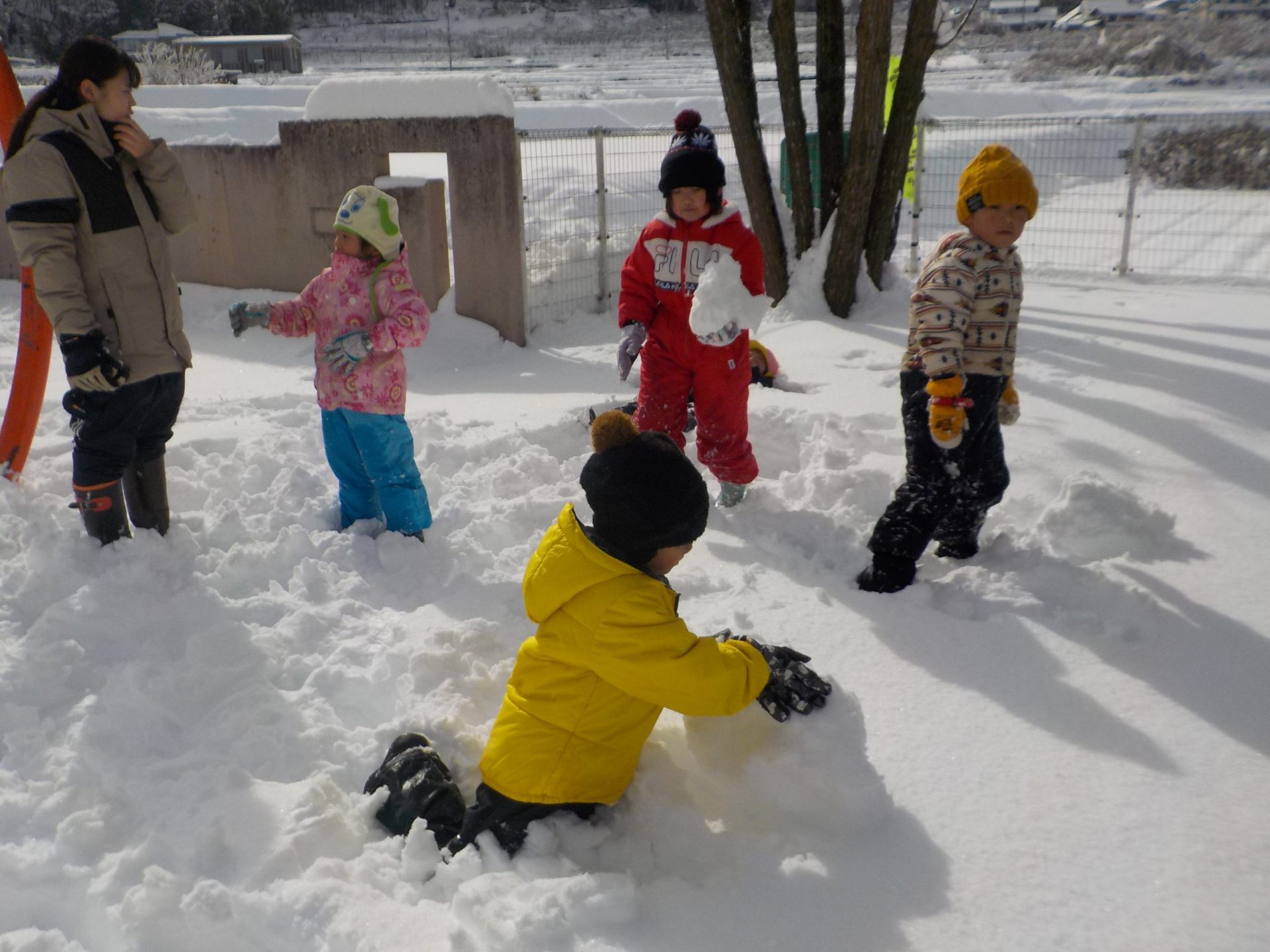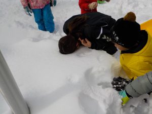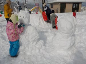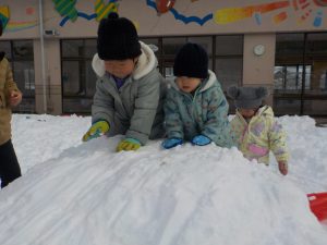 雪の中で夢中になって遊んでいる子ども達の姿は、生き生きとしています。自分がやりたいと思う遊びをしながら、外で遊ぶ爽快感や満足感、達成感など、一人一人が自然の中でたくさんの思いを感じているのだと感じました。