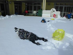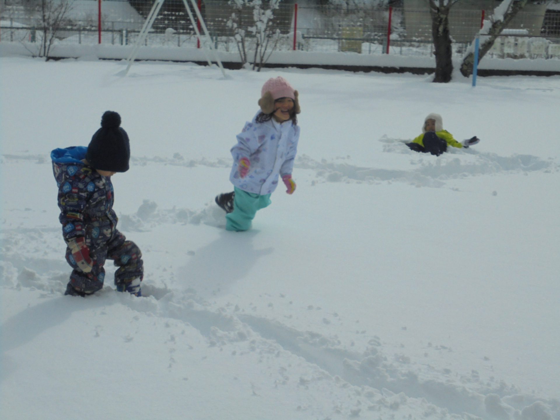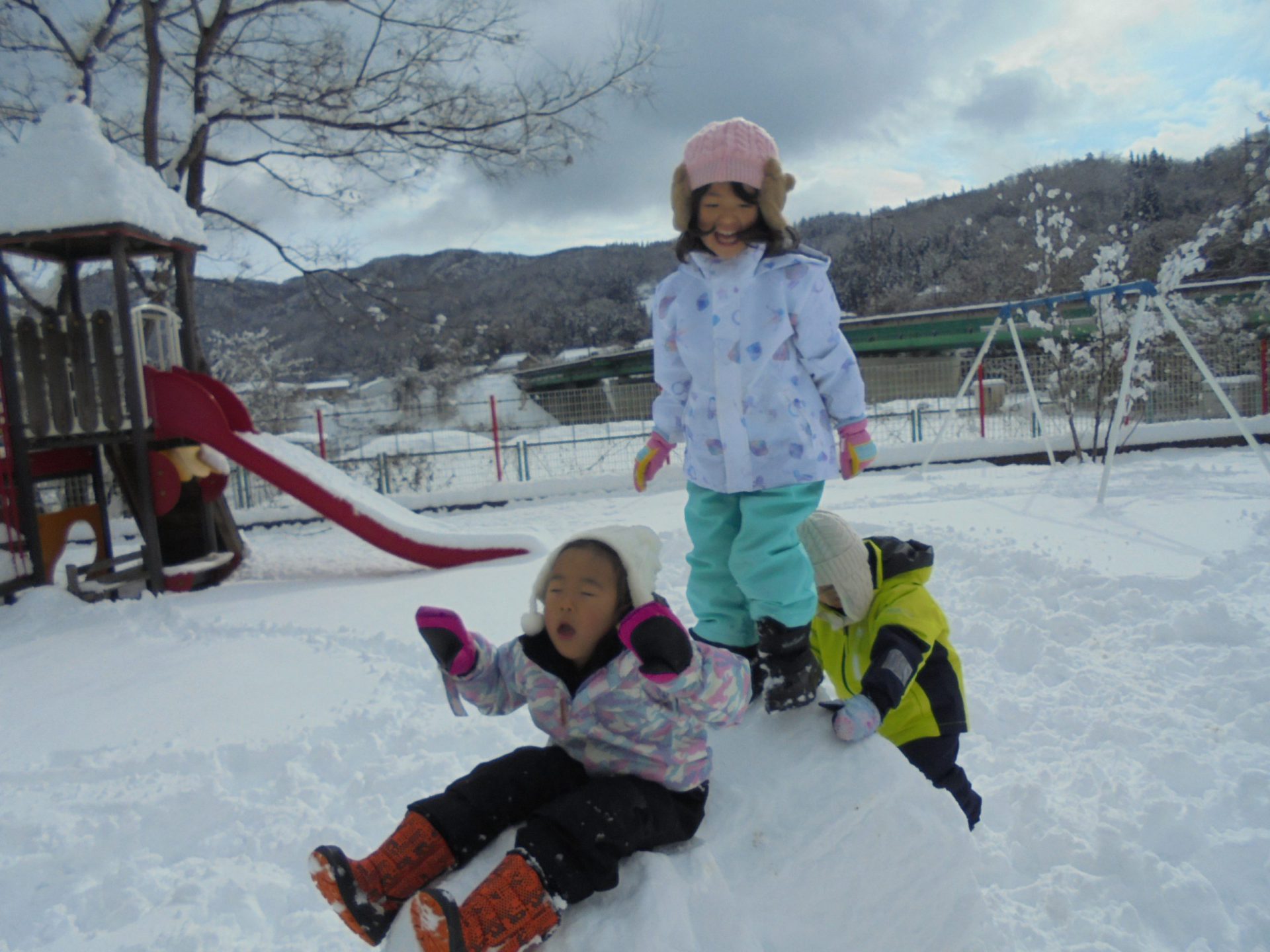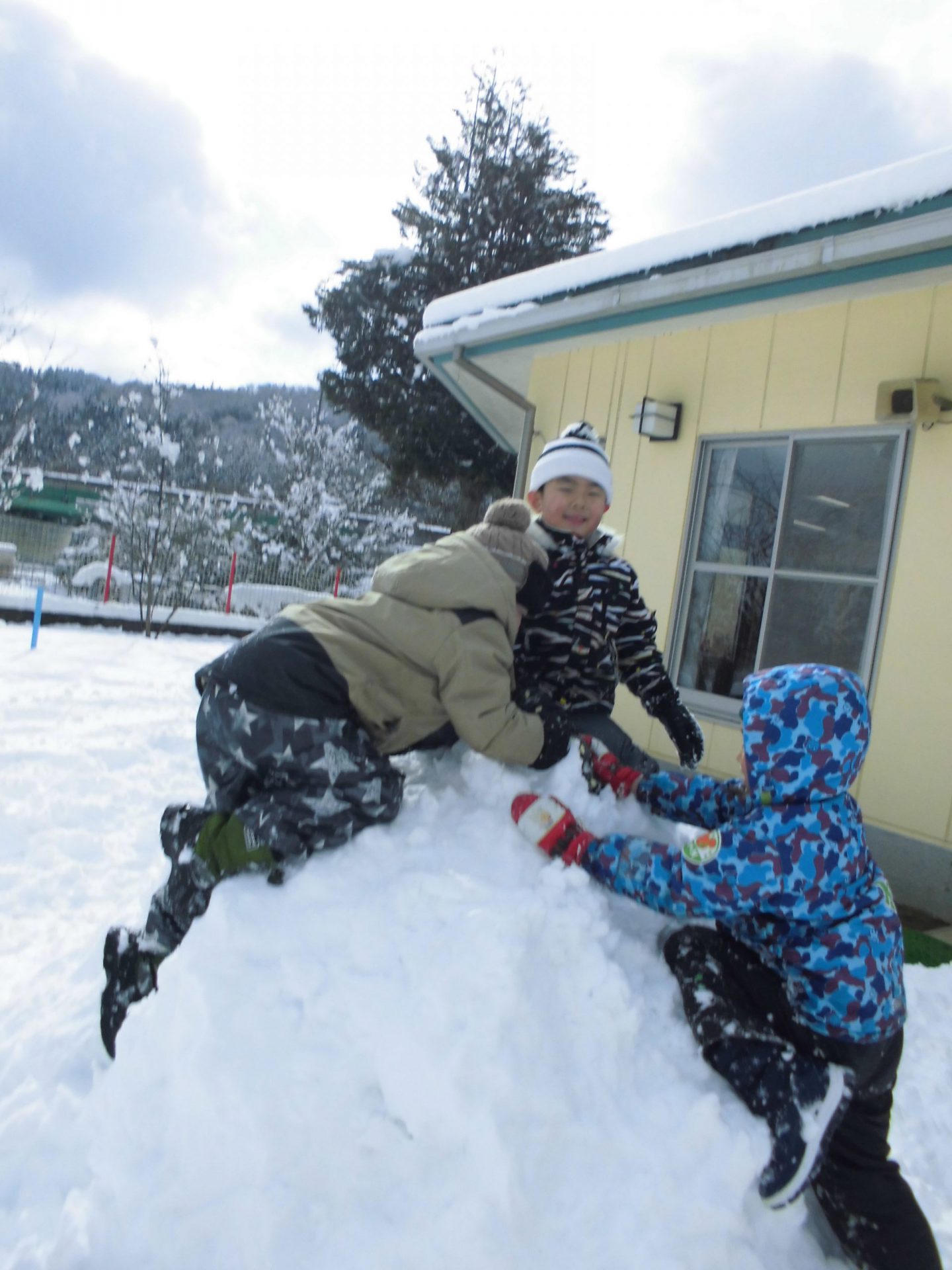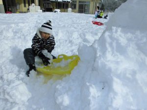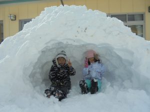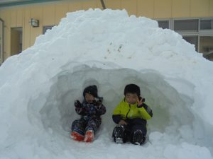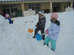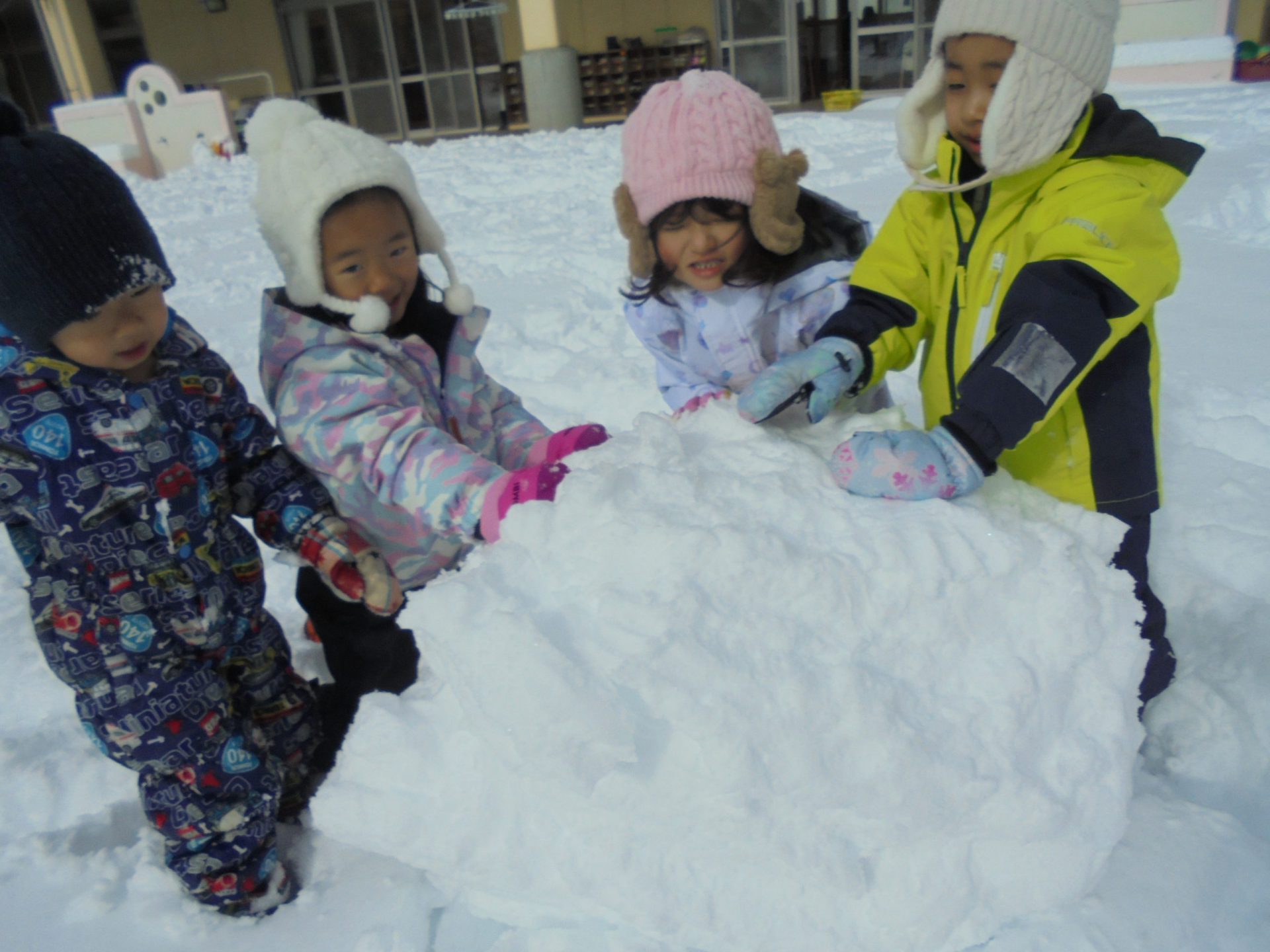 年長さんは、「かまくらを作ろう!」と雪を集めたり、固めたり。
