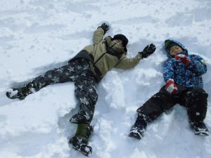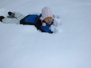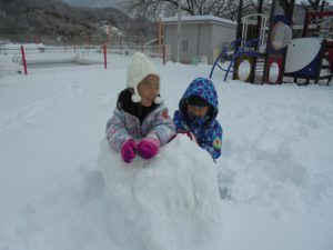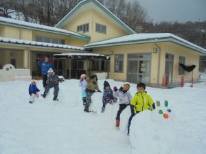 雪玉をつなげて『あおむし列車』のできあがり!!