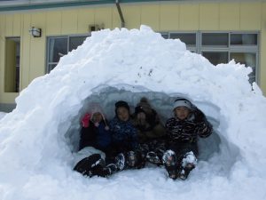 そのうちに、かまくらも雪玉もみんなで作りはじめ