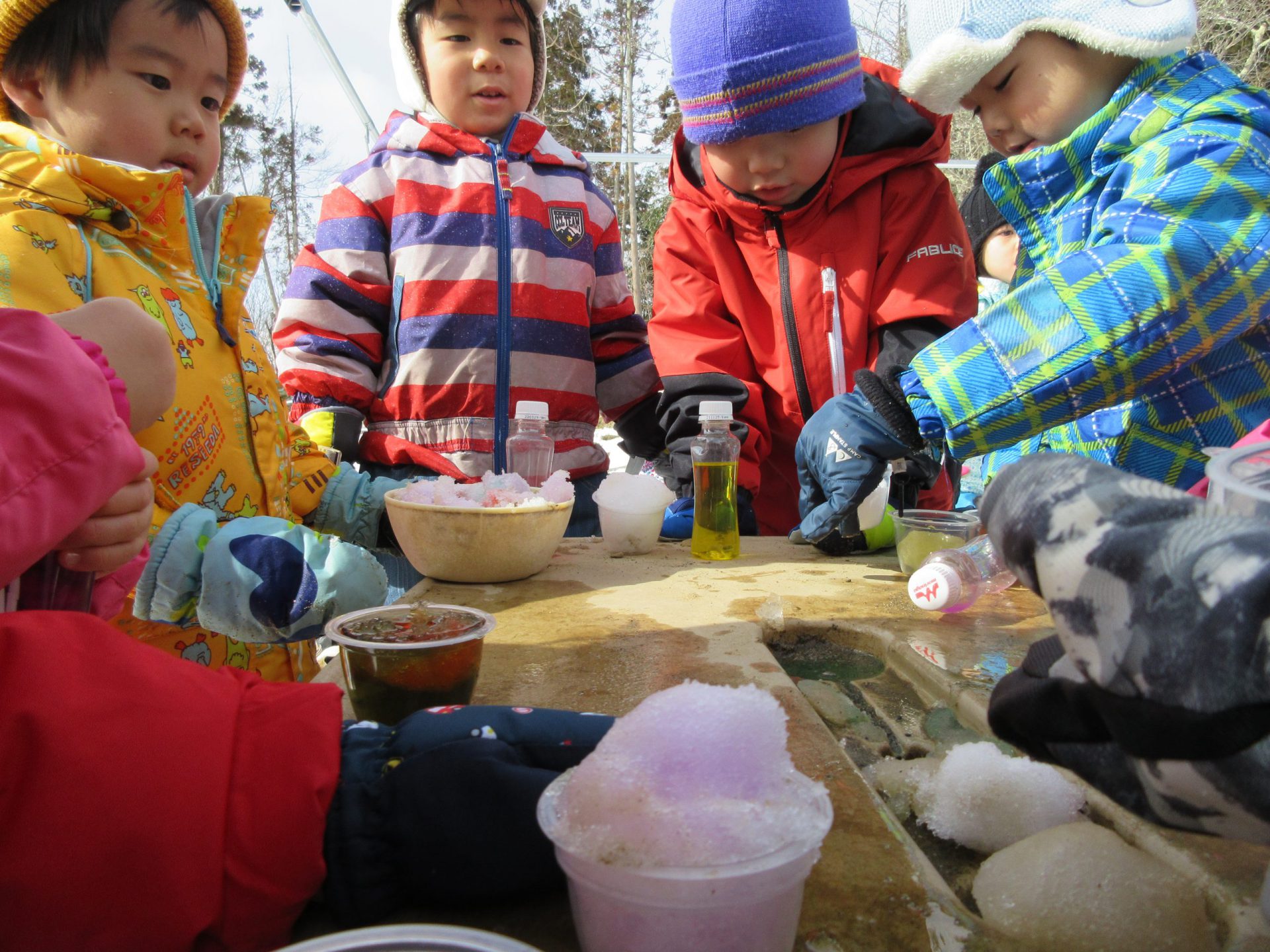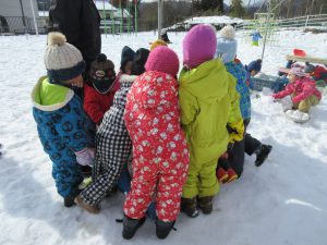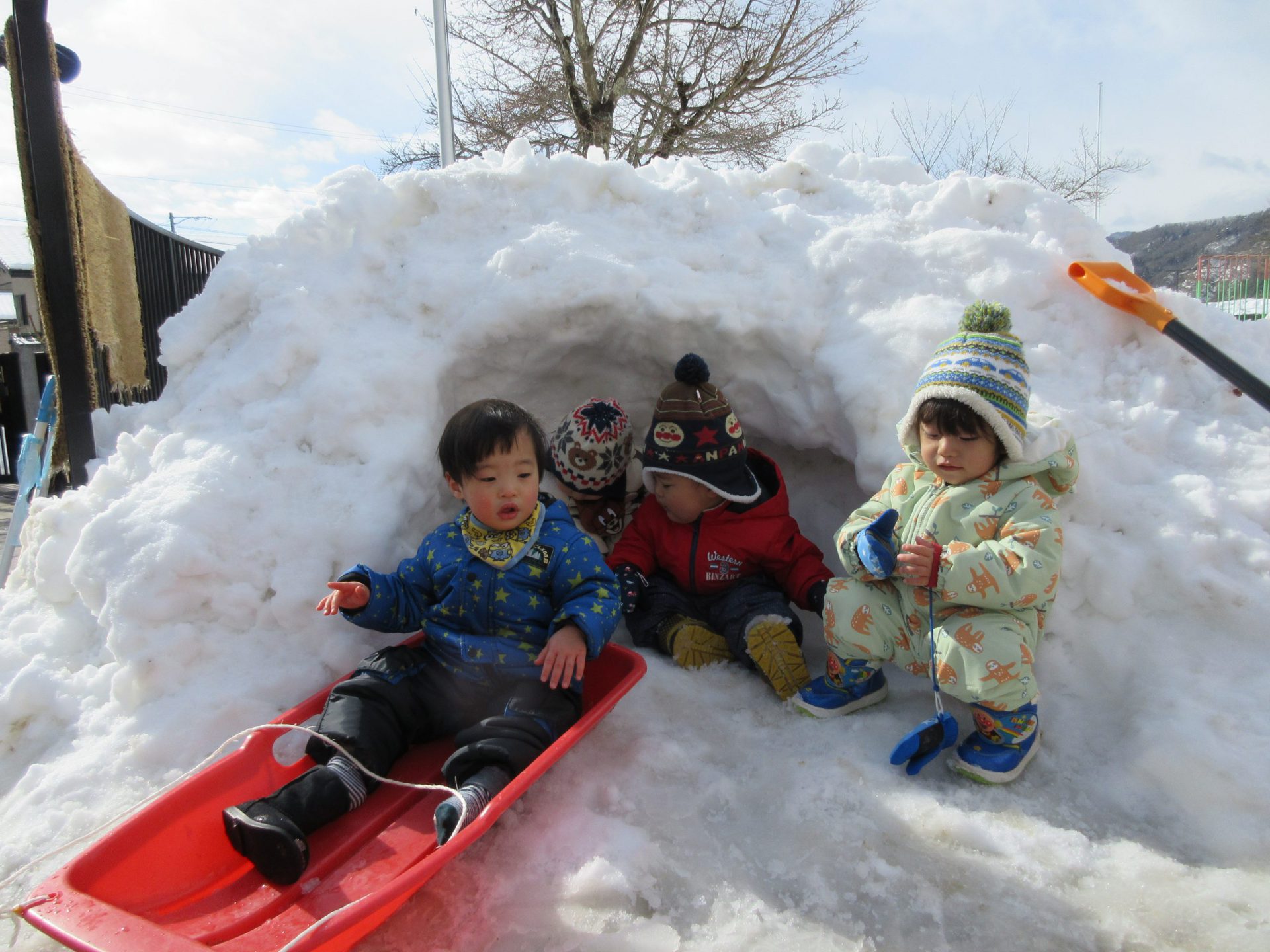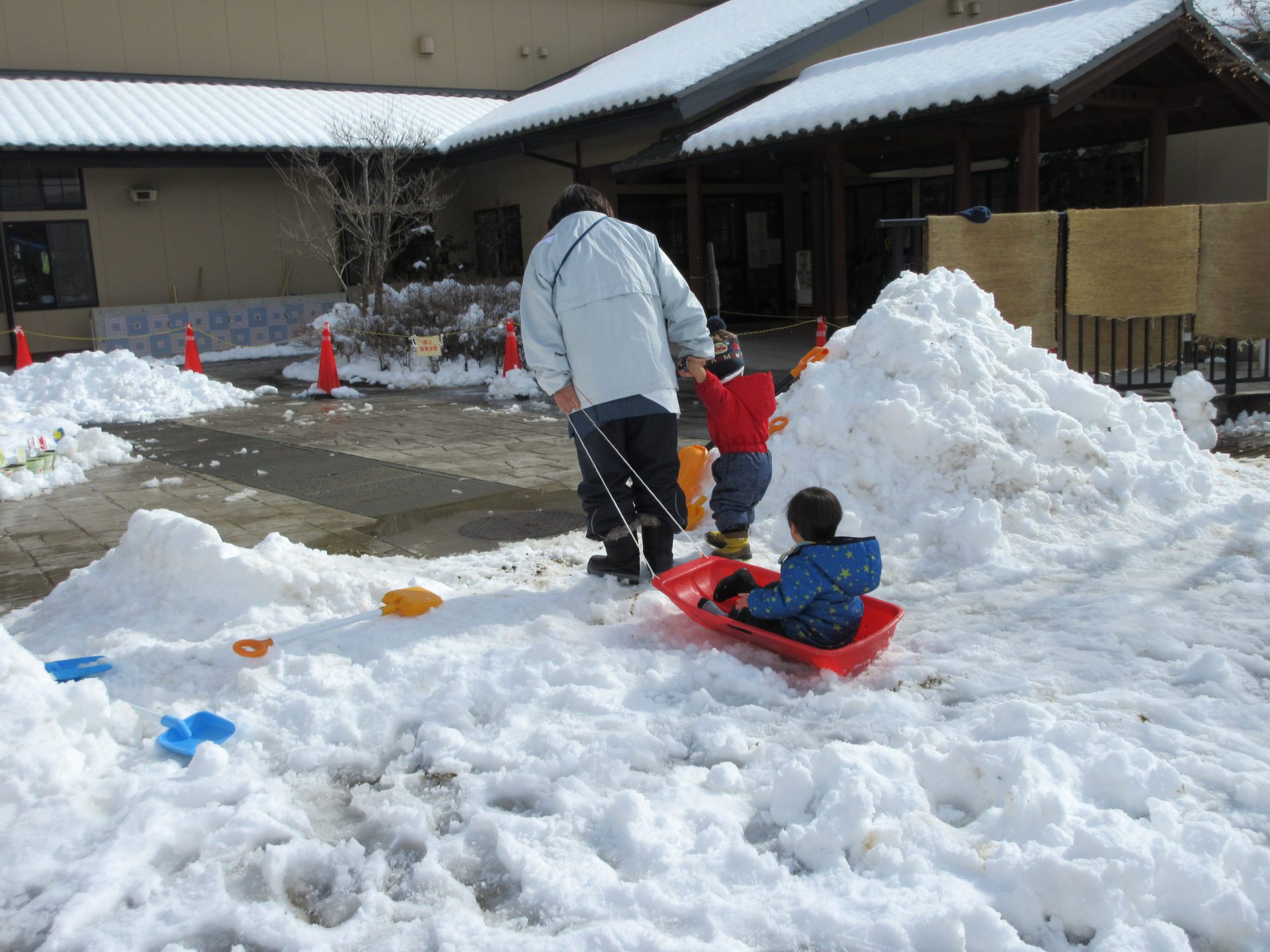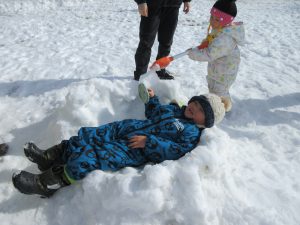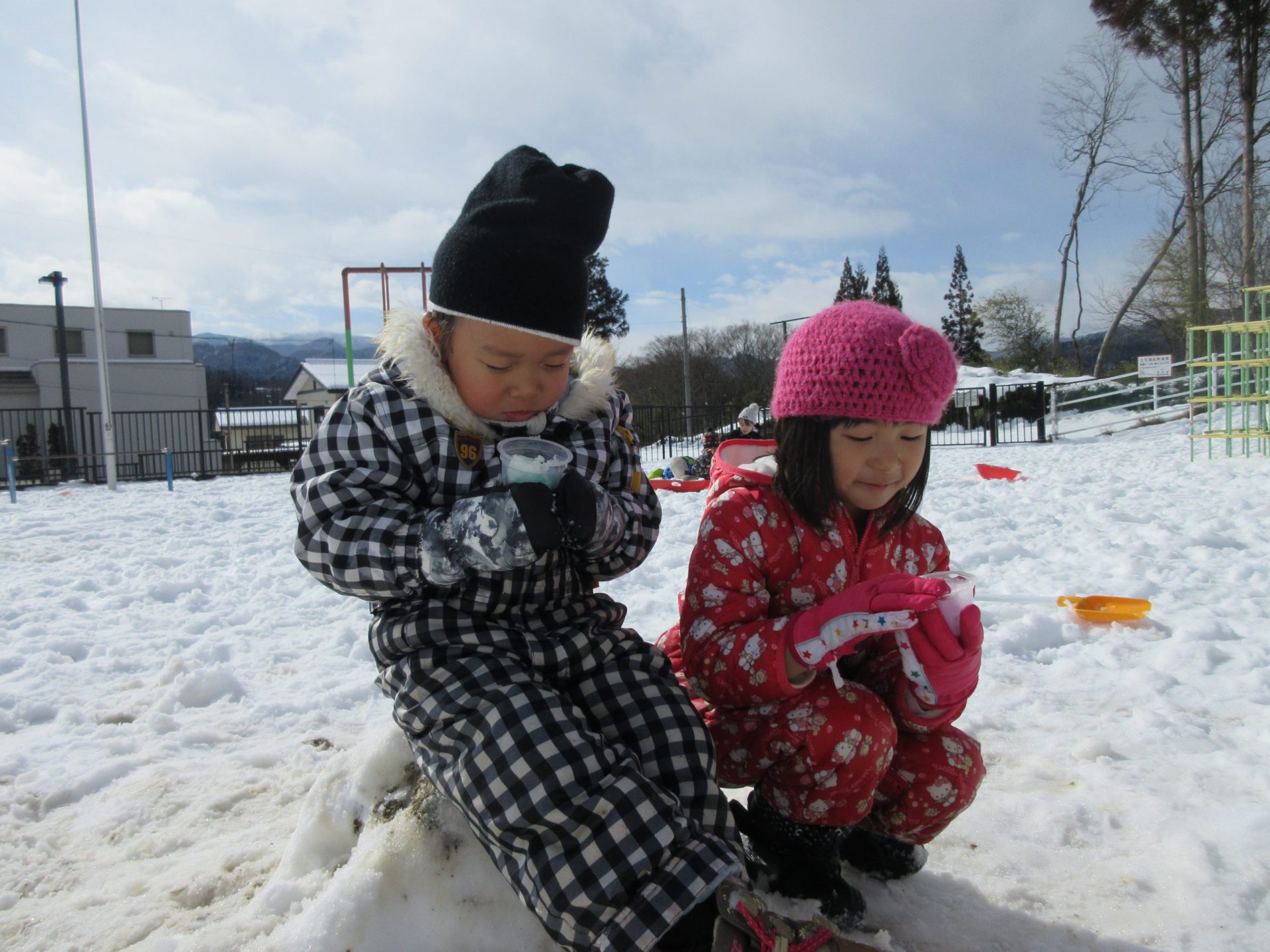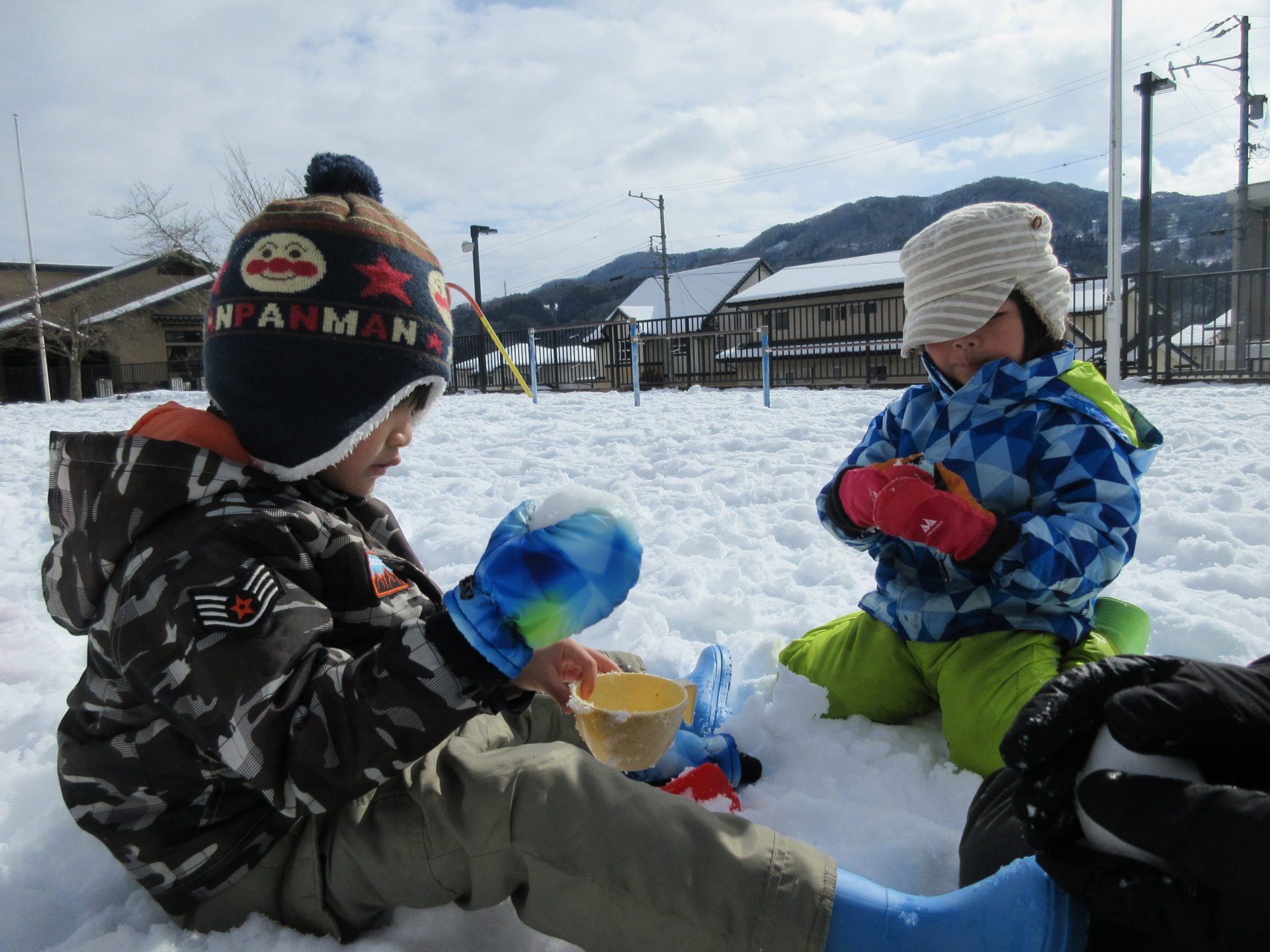 雪が積もった園庭で思い思いの遊びを楽しみました。