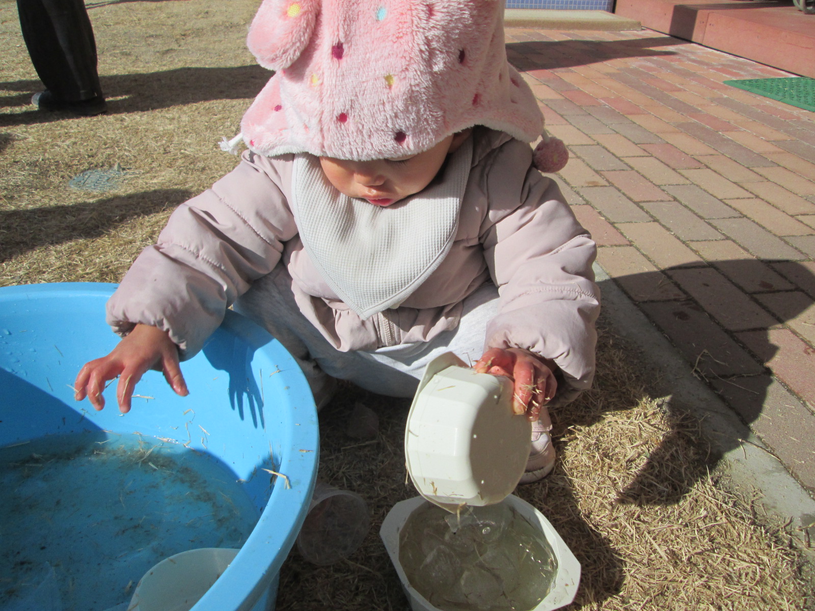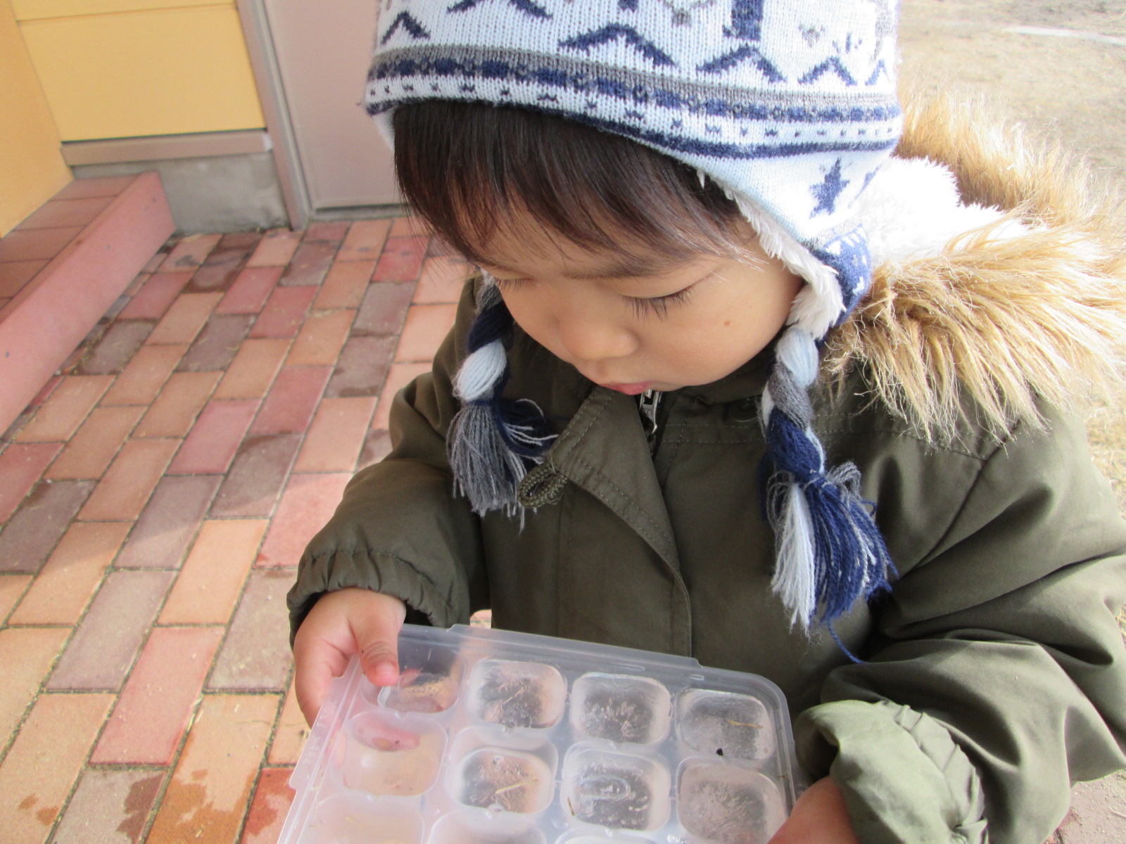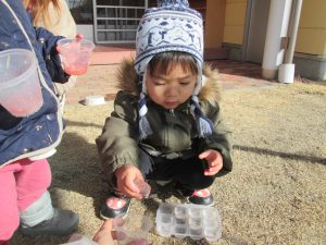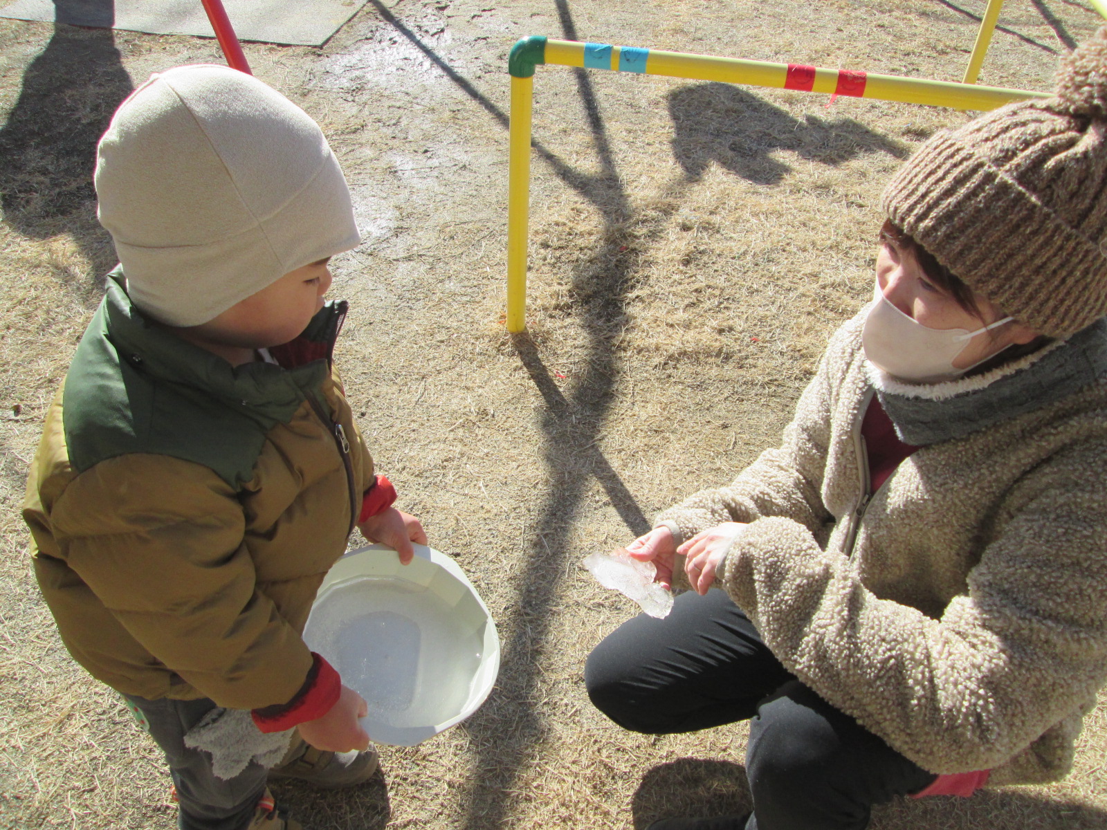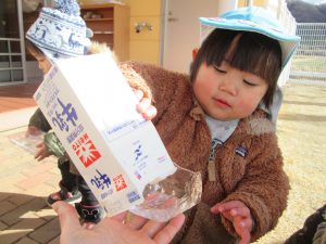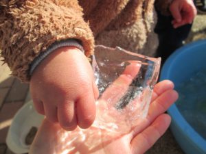 ・冬ならではの氷の冷たさ、感触を知り触れたりしてほしいと願い、氷あそびをとり入れてみました。