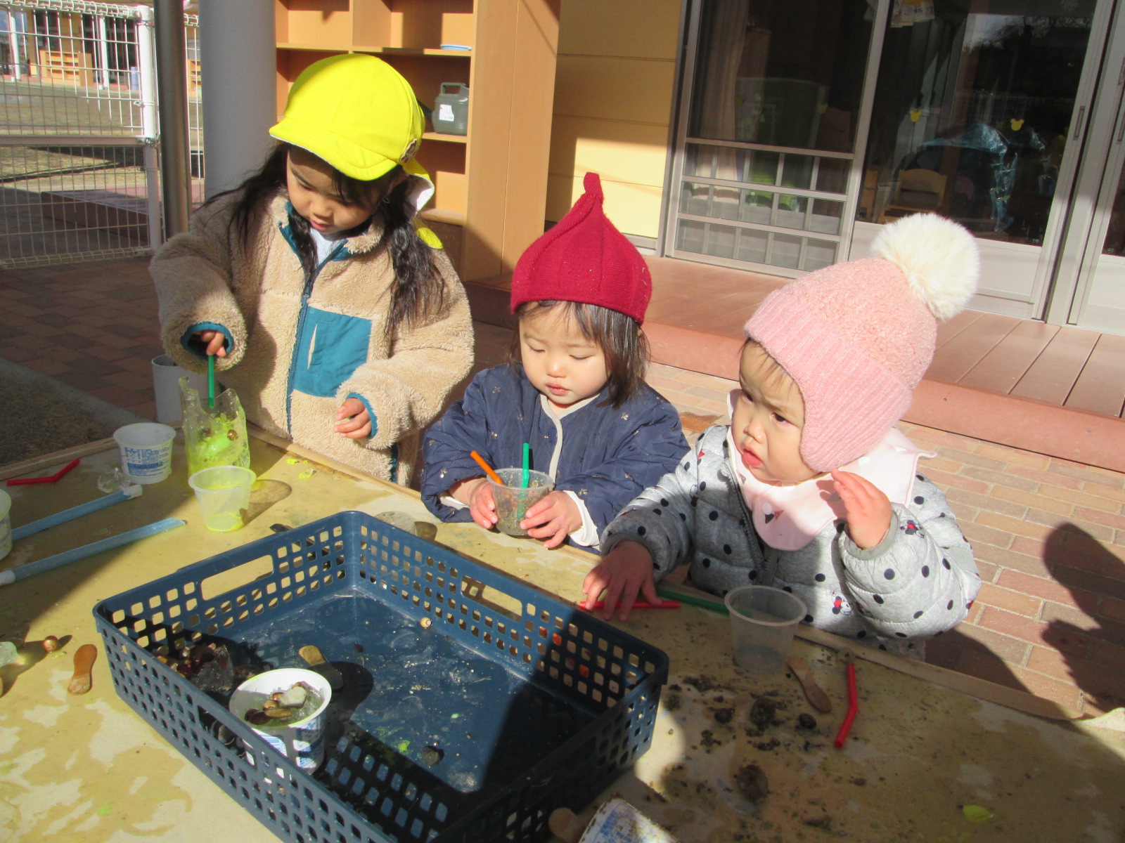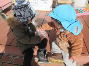 ・子どもの気づき、つぶやき、発見に保育士自身も驚かされ、刺激を受けながら一緒に楽しく遊んできました。残り少ないですが、冬ならではの遊びの機会を大切にしていき、言葉にならない思いを代弁しながら、好奇心や興味を広げていけたらと思っています。