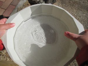 容器を持ち、手で左右に動かしながら水の型が変わることを発見し、