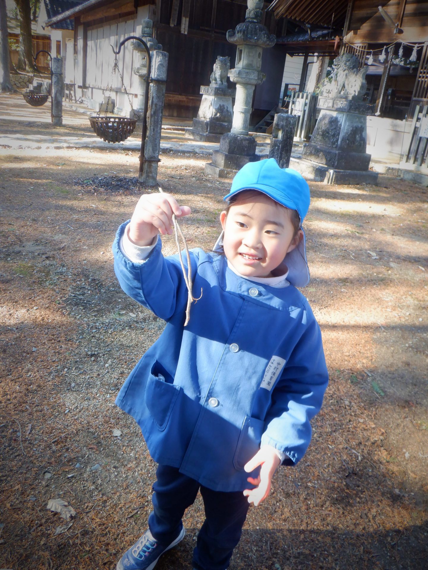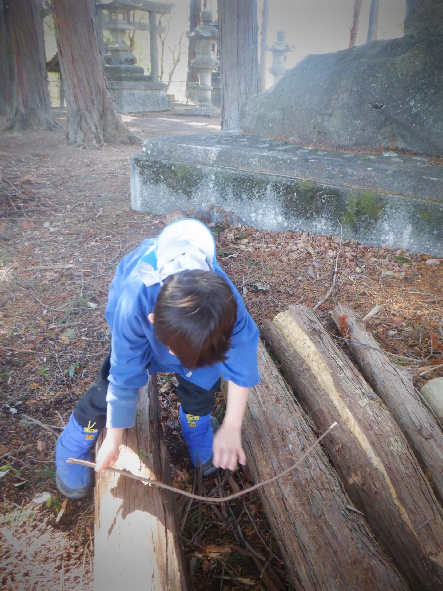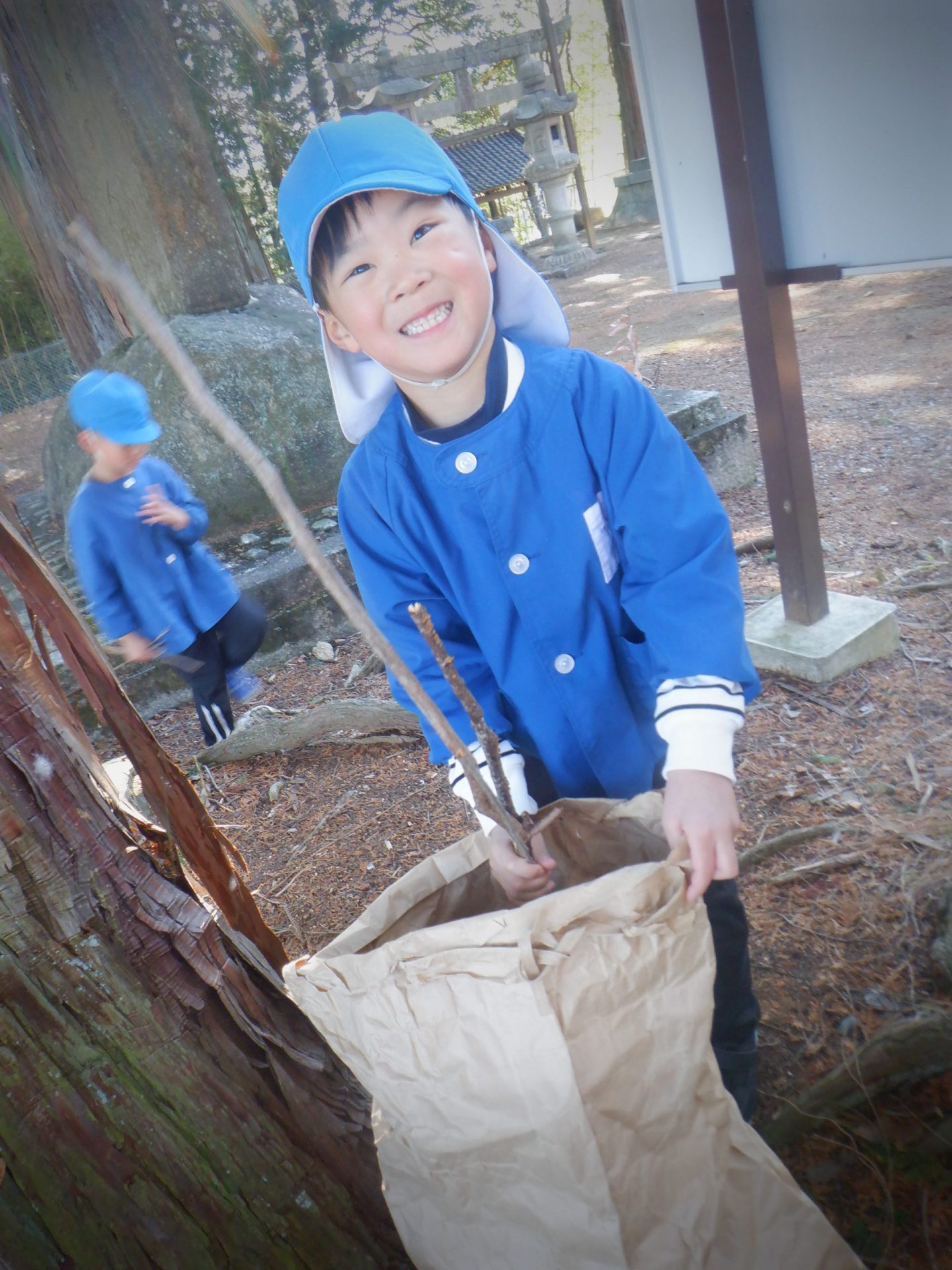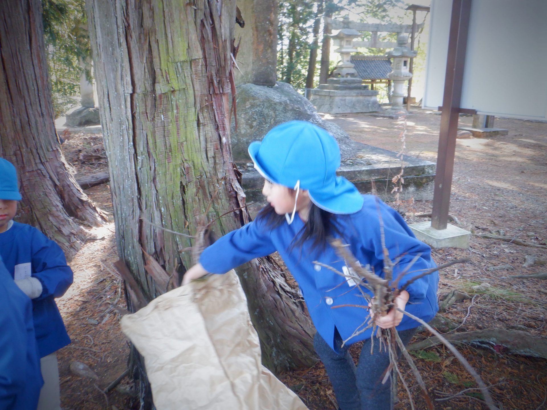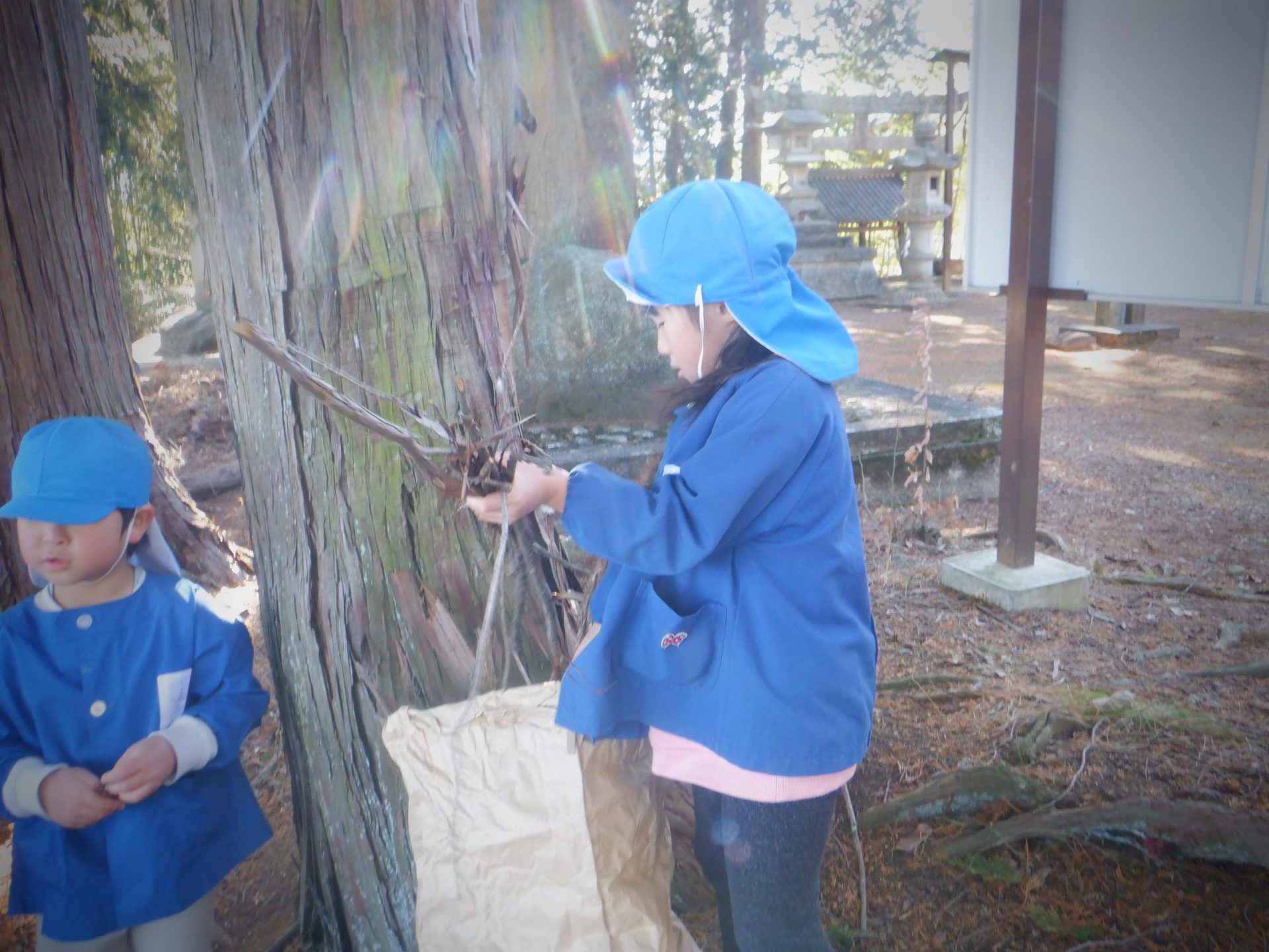 中村神社へ出かけ、薪拾いをしました。まずは木の棒をたくさん集めだし、袋にたくさん入れていました。