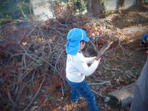 ・枝を集めながらも色々なものに見立てたり、火をつけるためにはどんなきが良いかを今までの経験から考えて集める姿があった。