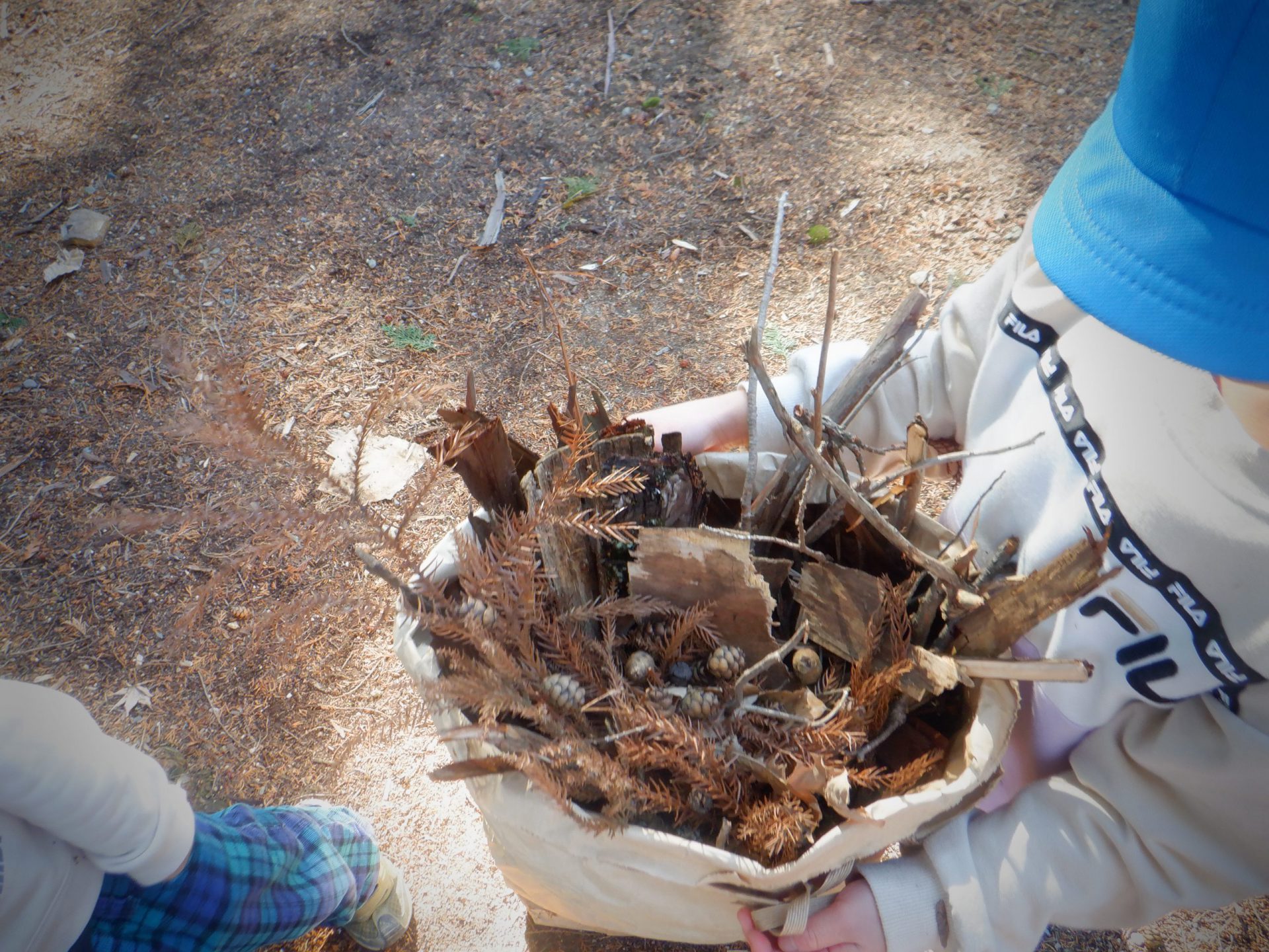 ・「これはパチパチいうやつだ。」「乾いている木はこれ!」と火をつけるという目的を持って拾うことができたのではないか。