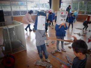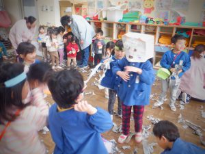次の日年長児が鬼になって、小さいお友だちは新聞紙で豆を作って豆まきのリハーサルです。