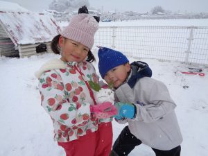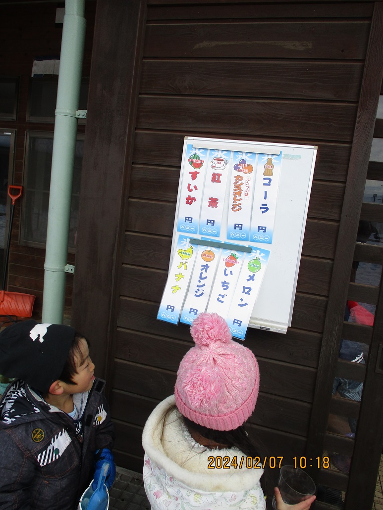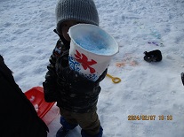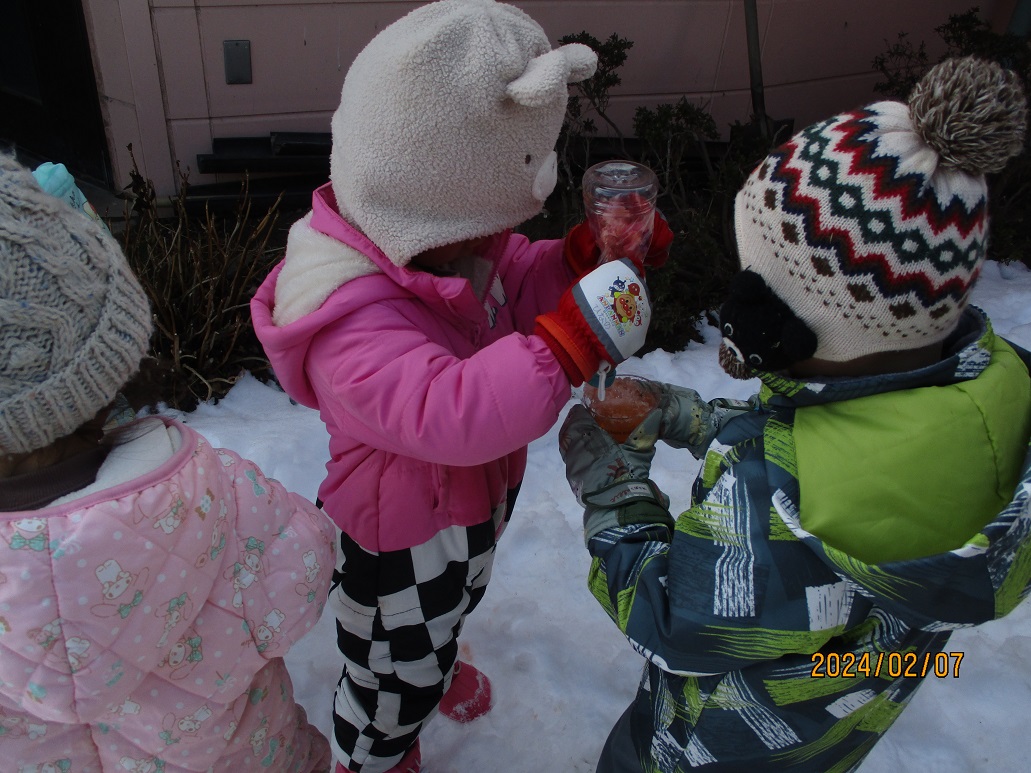 かき氷屋さんをやることによって、色の変化に気付いたり、友だちと協力して作ったり、年長さんが小さい子ども達に作り方を教えたりと子ども達もさまざまな経験をすることができた雪遊びでした
