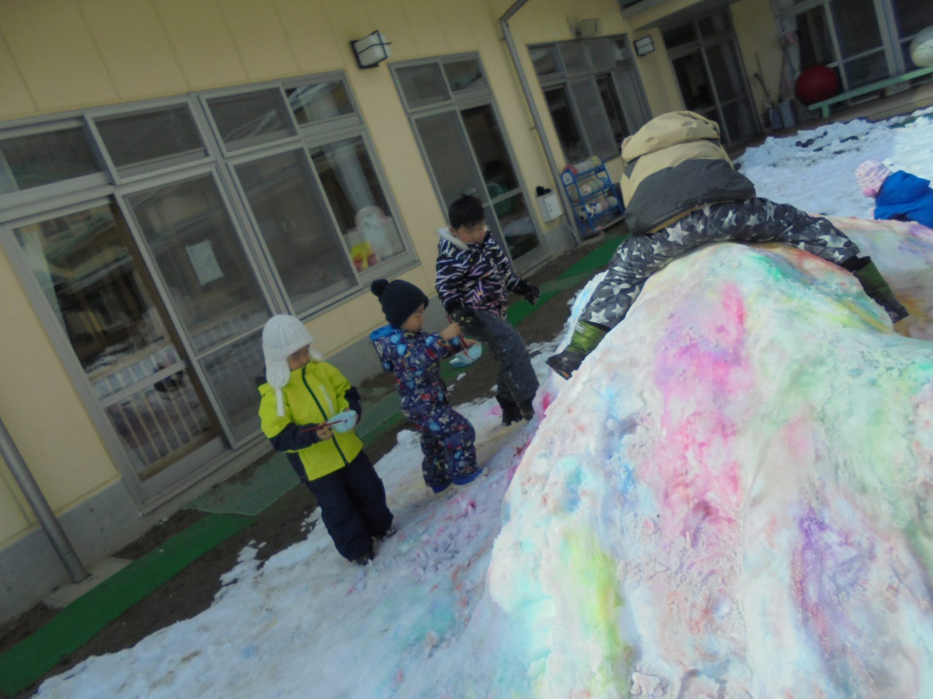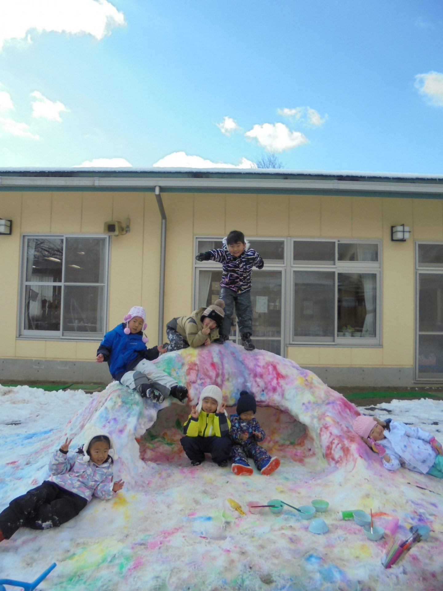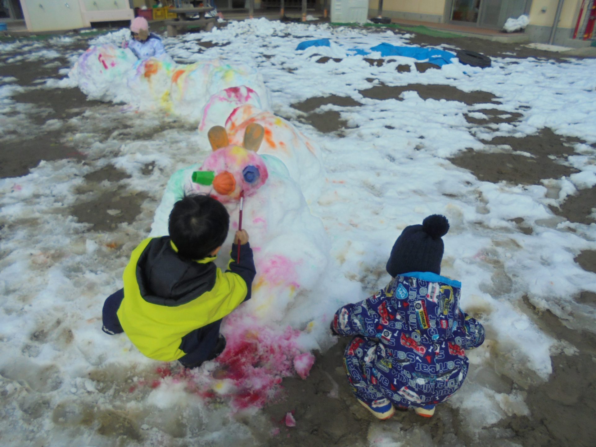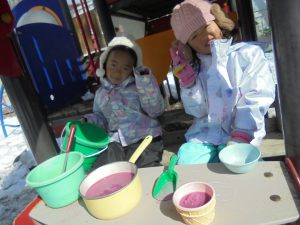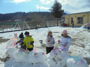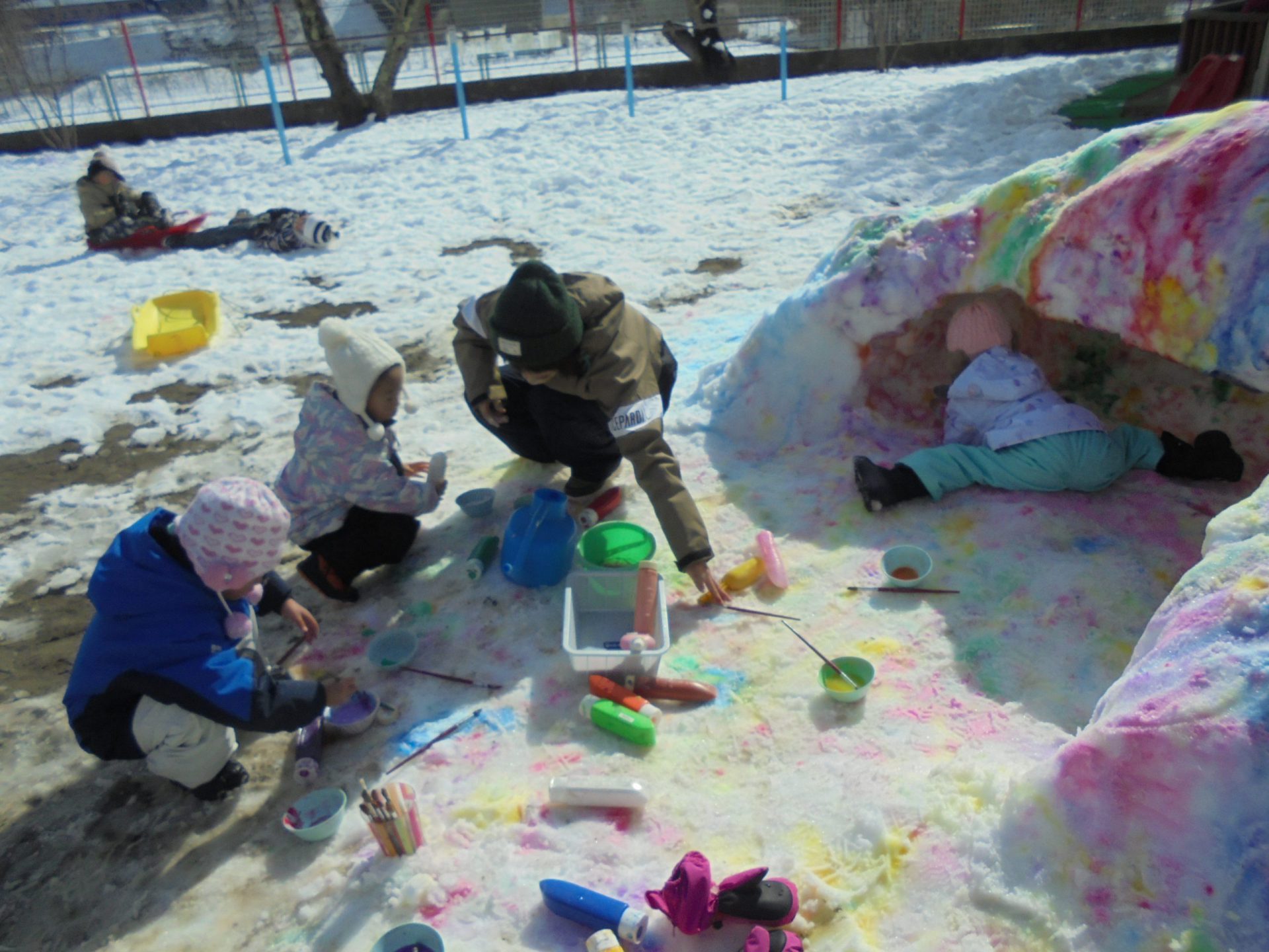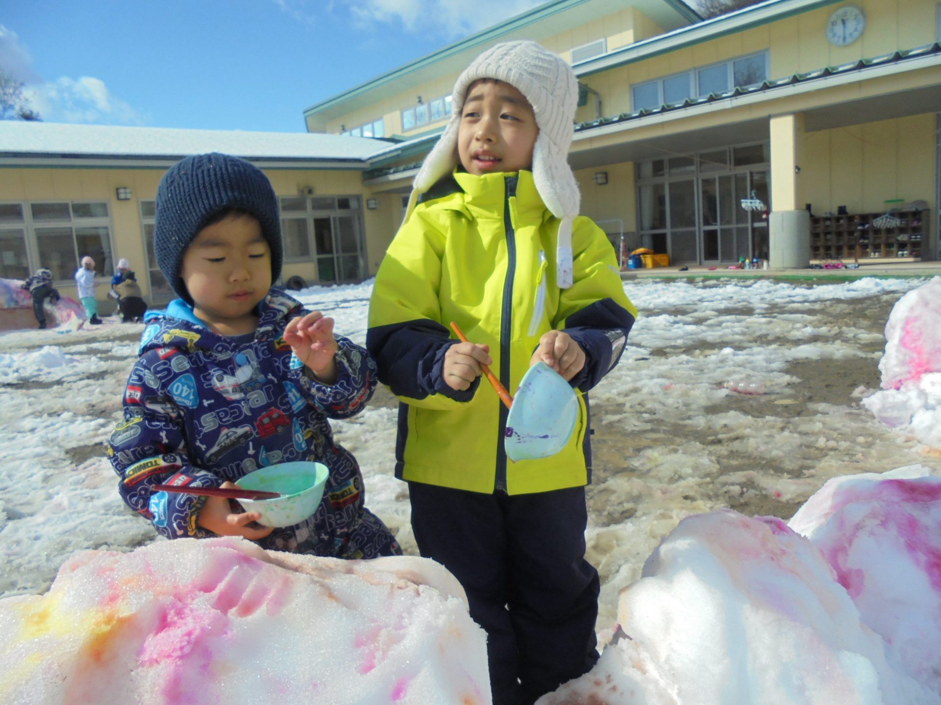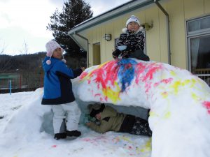 絵の具を水ではなく、雪でとき始めた子ども。周りの友だちに教えてあげていました。
