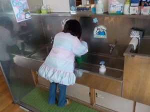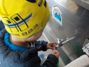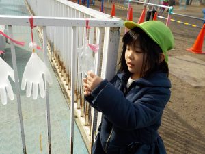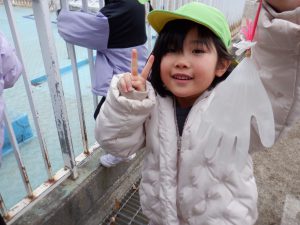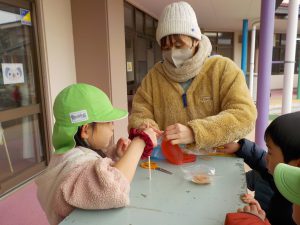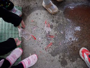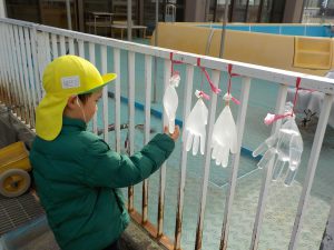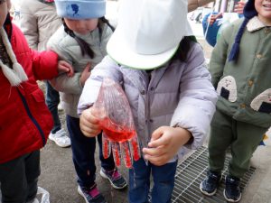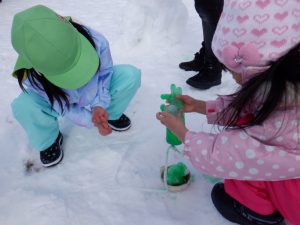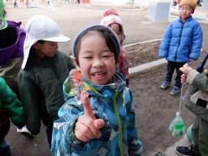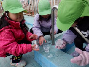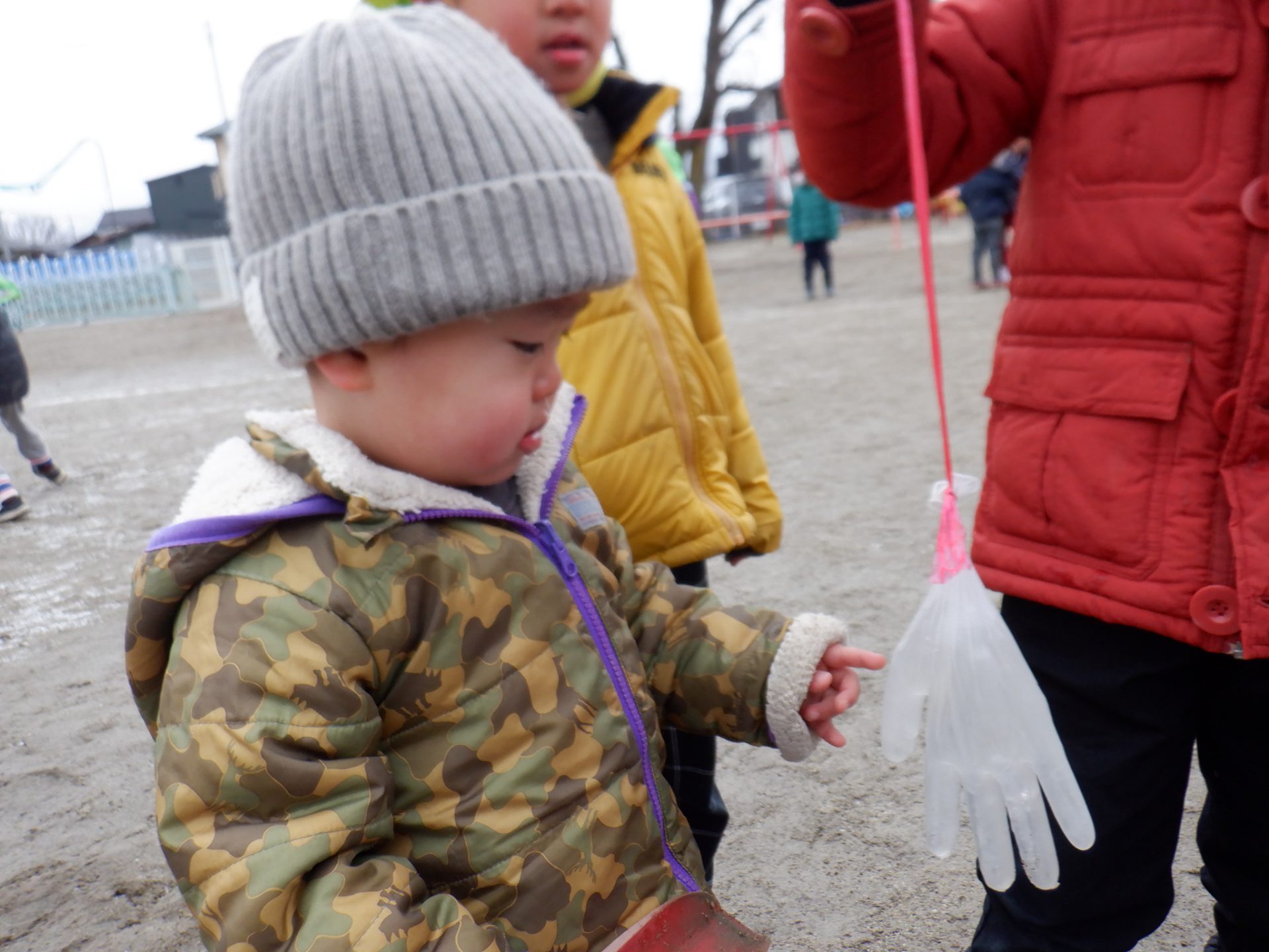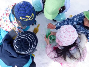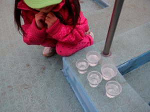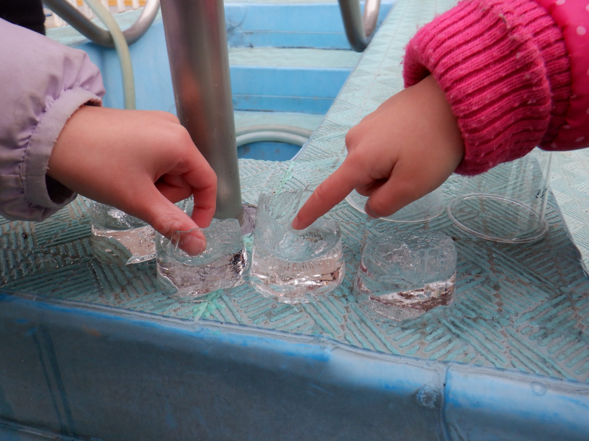氷作りをして、毎朝戸外に出ると凍っているか凍っていないかを確認する子ども達。