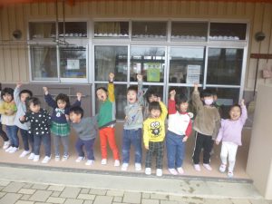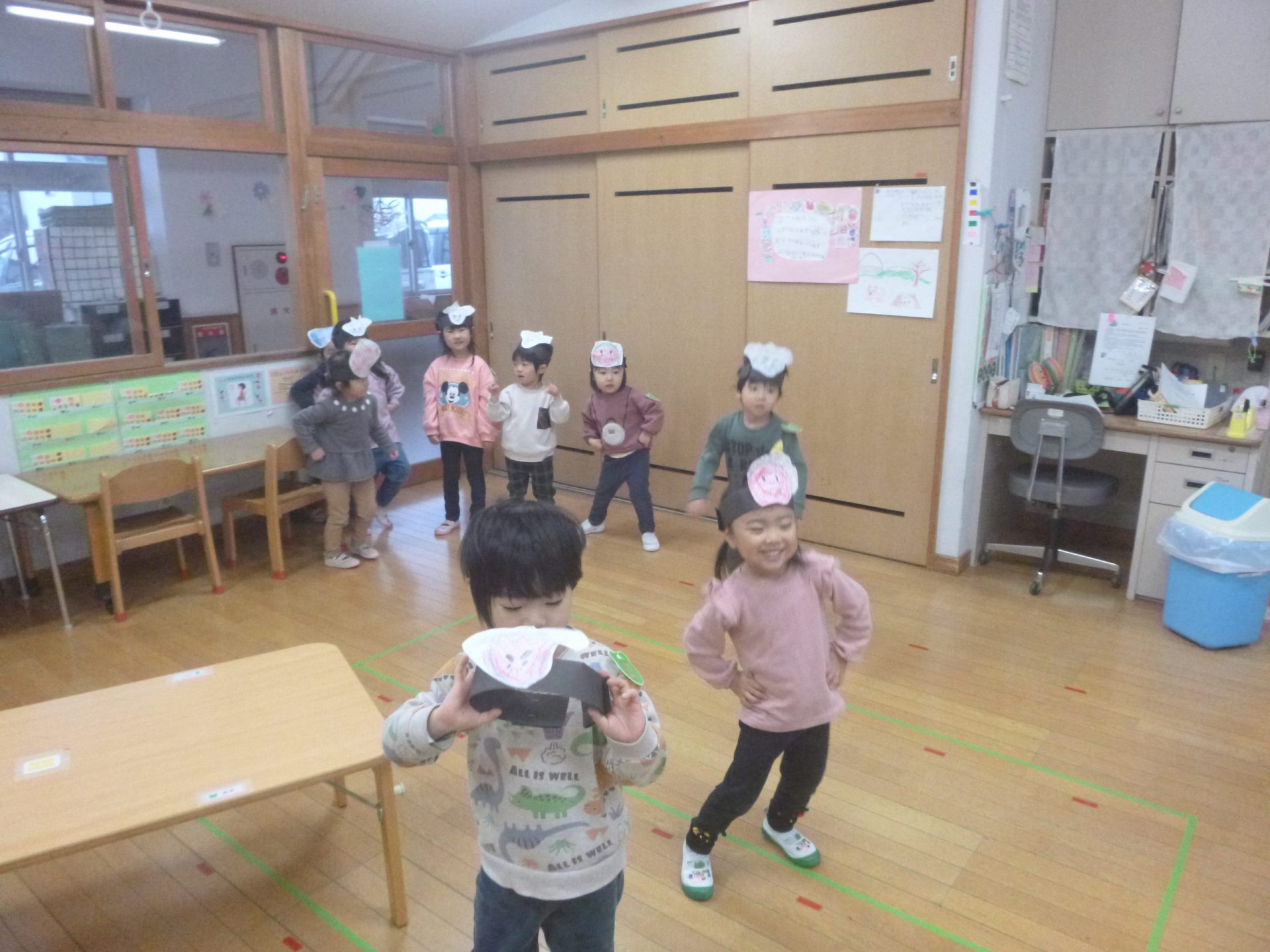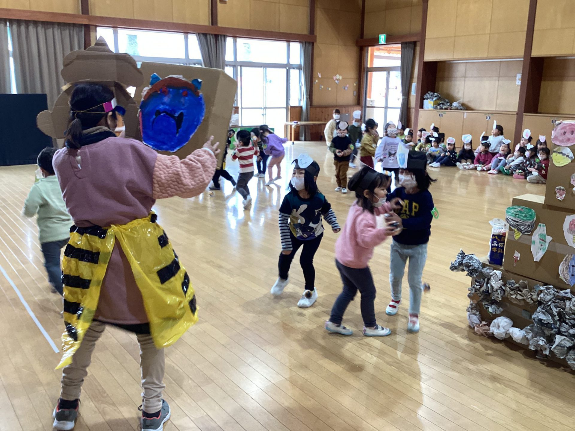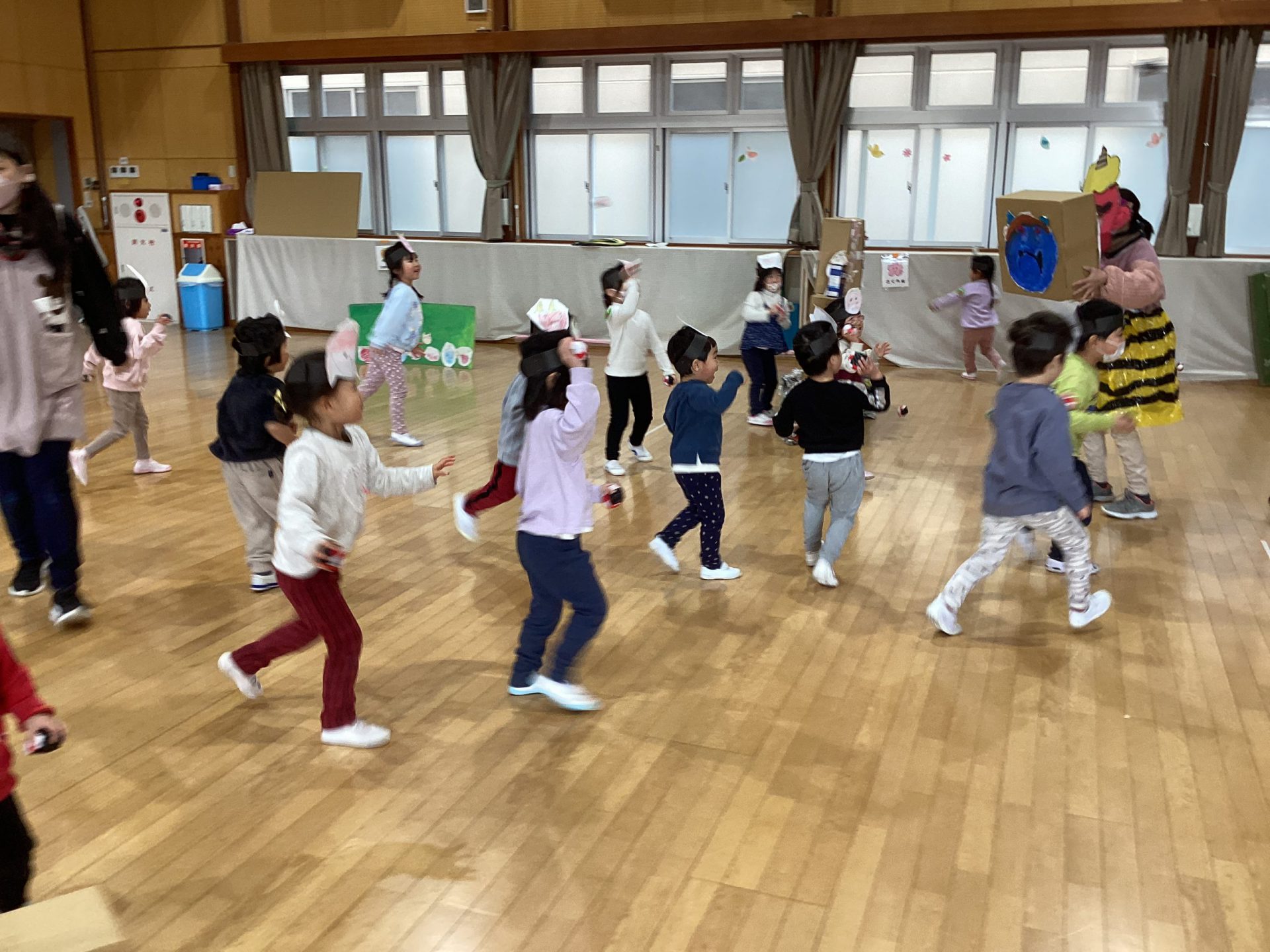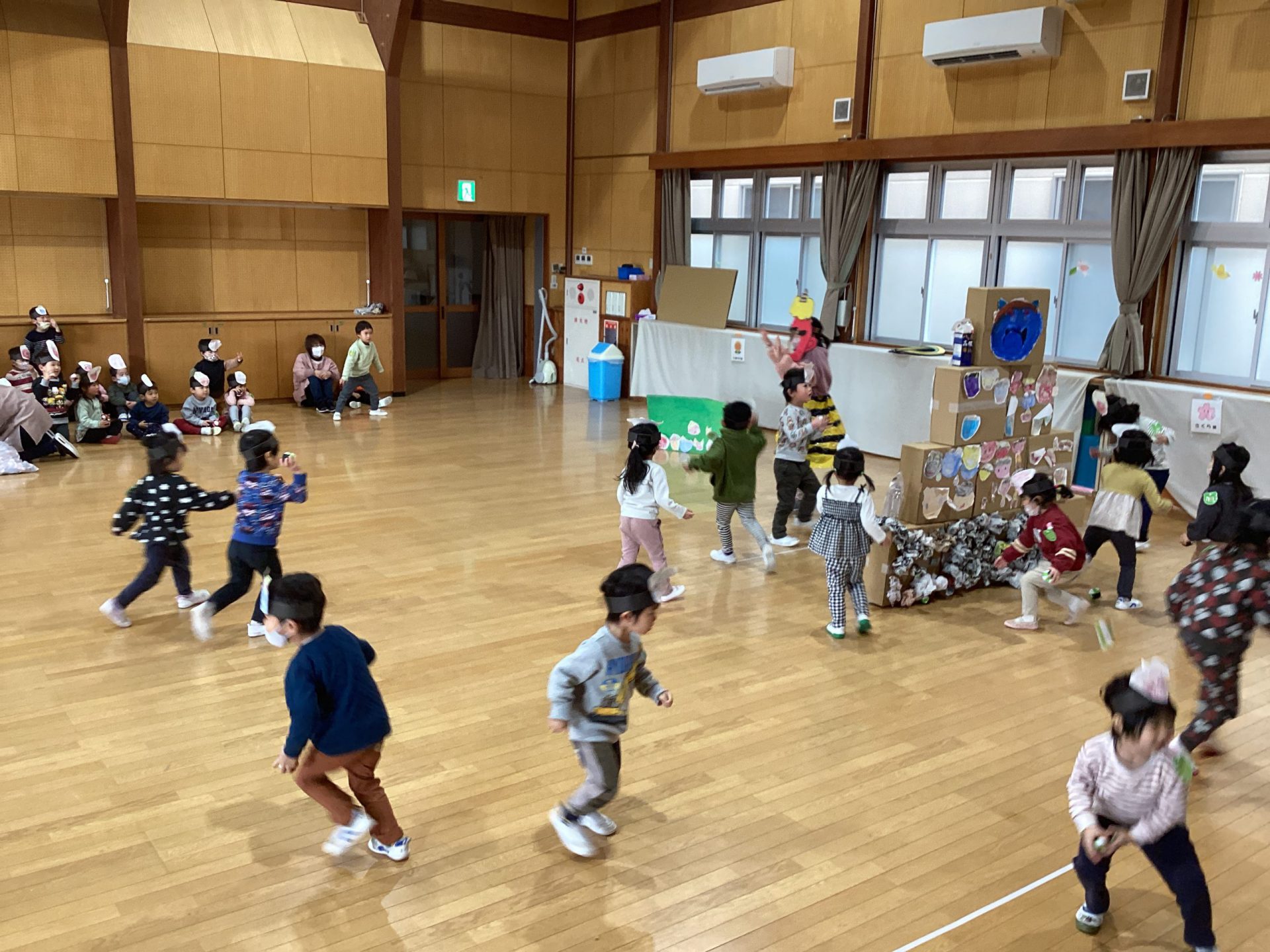 「おなかの中には鬼がいる」の絵本から各クラス鬼退治をしようと「鬼さんスクラム」「鬼のじまん」「節分戦隊おにレンジャー」を踊り、節分に備えました。