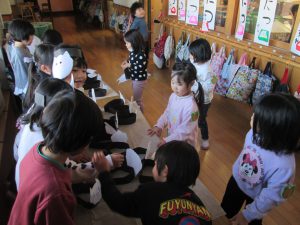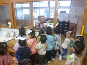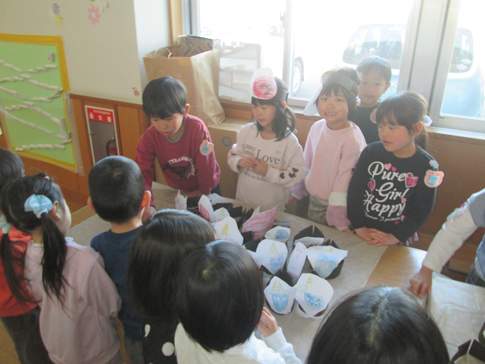 しばらくして、「年長さんがお腹の中の鬼を退治できるように」と年少さんに鬼のお面を作ってくれました。