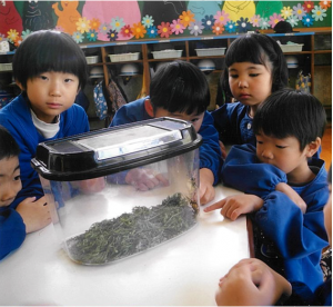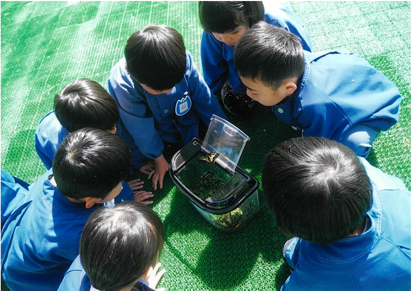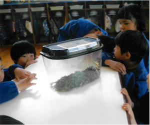 ・図鑑には書いてなかったが卵からかえった時についていた草(今回は人参の葉)しか食べないことも伝えた。人参の葉をやり日々大きくなっていったあと飼育ケースの壁を登って行く時の腹側の様子も興味深そうに見ていた。糸を張りはじめたアオムシの上に別のアオムシが乗ってしまい2匹で喧嘩する様子をとても心配そうに見ていた子どもたち。