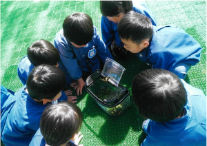 ・なかなか飛び立たないちょうちょを心配して何度も見たり自分の指にのせてみたりしていた。口の先がクルクル丸くなっているところや頭の周りにフワフワした毛があることにも気づいたようである。観察するうち愛着が湧いてきて飛び立った時には歓声が上がった。一方、脱皮に失敗し羽が伸びず飛べないちょうちょもいた。子どもたち同士どうしたらいいのか話す中でこのままケースに入れておいても死んでしまうから、外に出してあげようということになり咲いていた花の上にそっとおいてあげていた。
