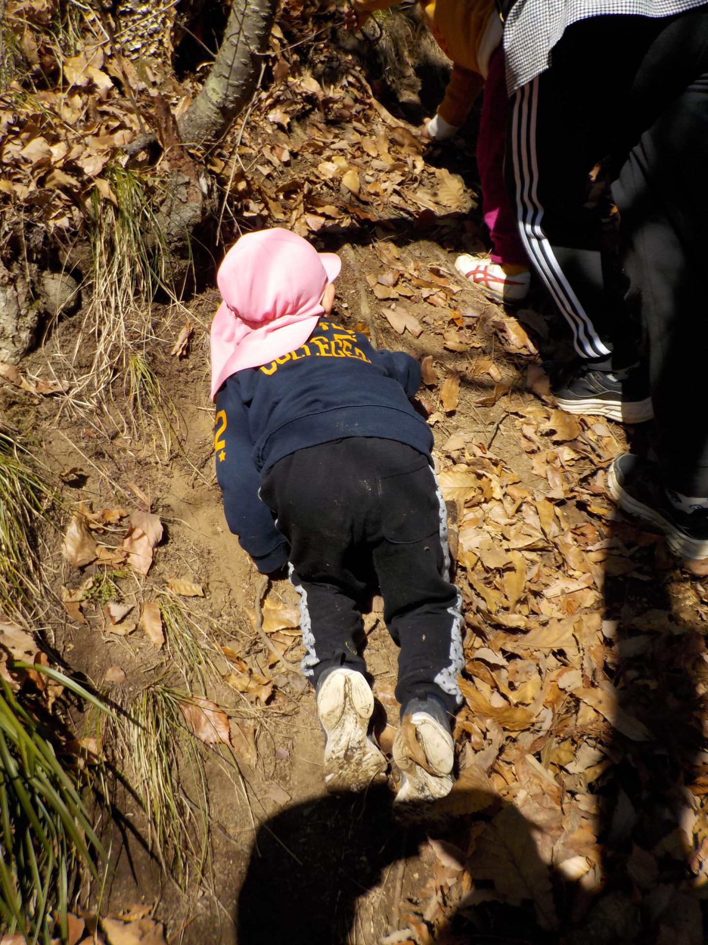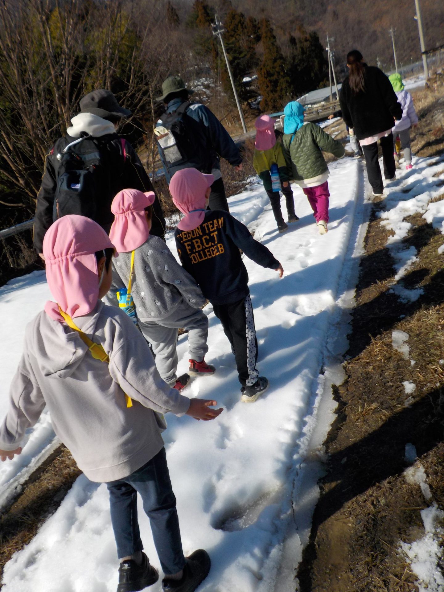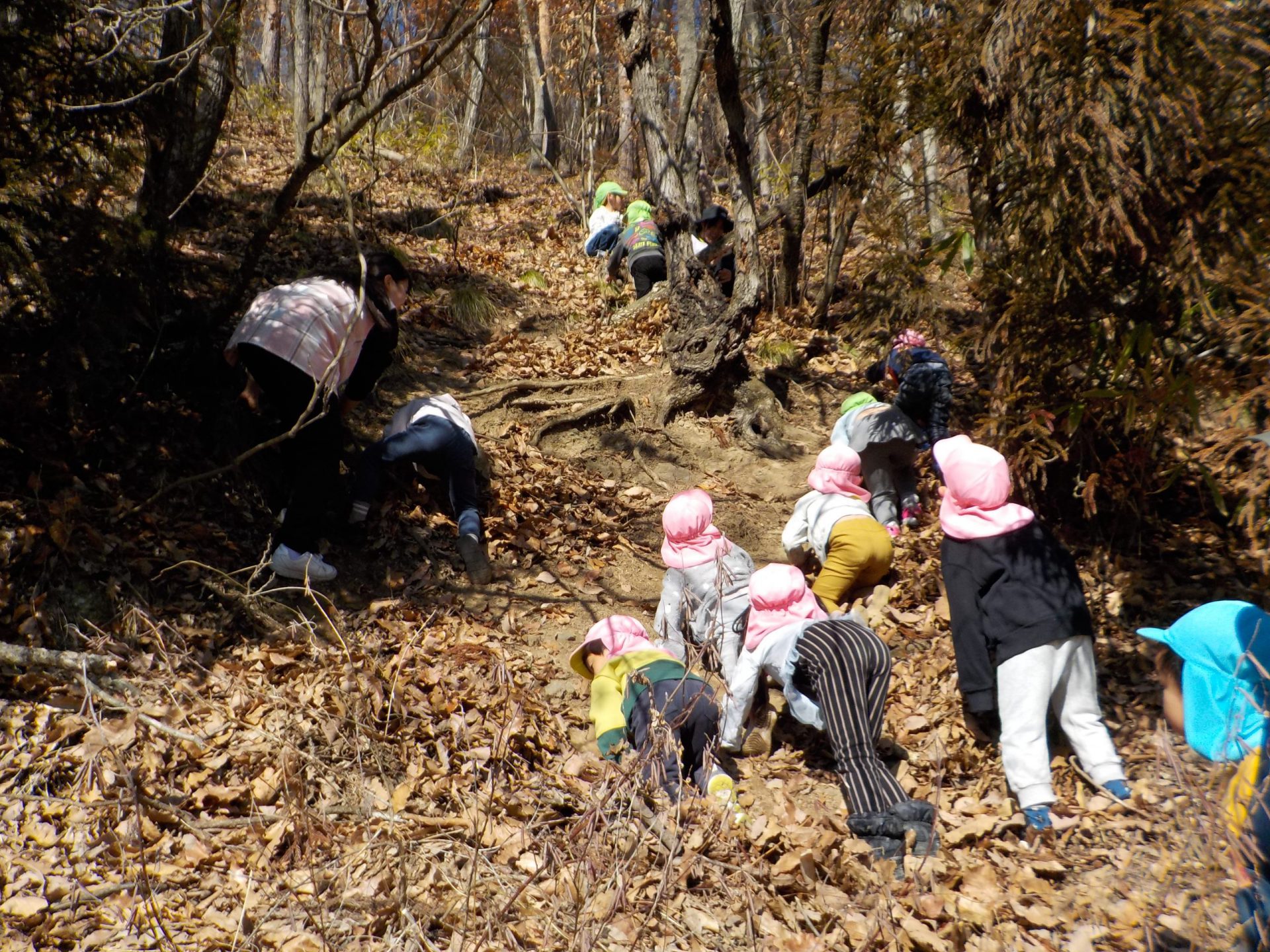 年中さん(桃色の帽子)、年少さん(水色の帽子)が登っていきます。