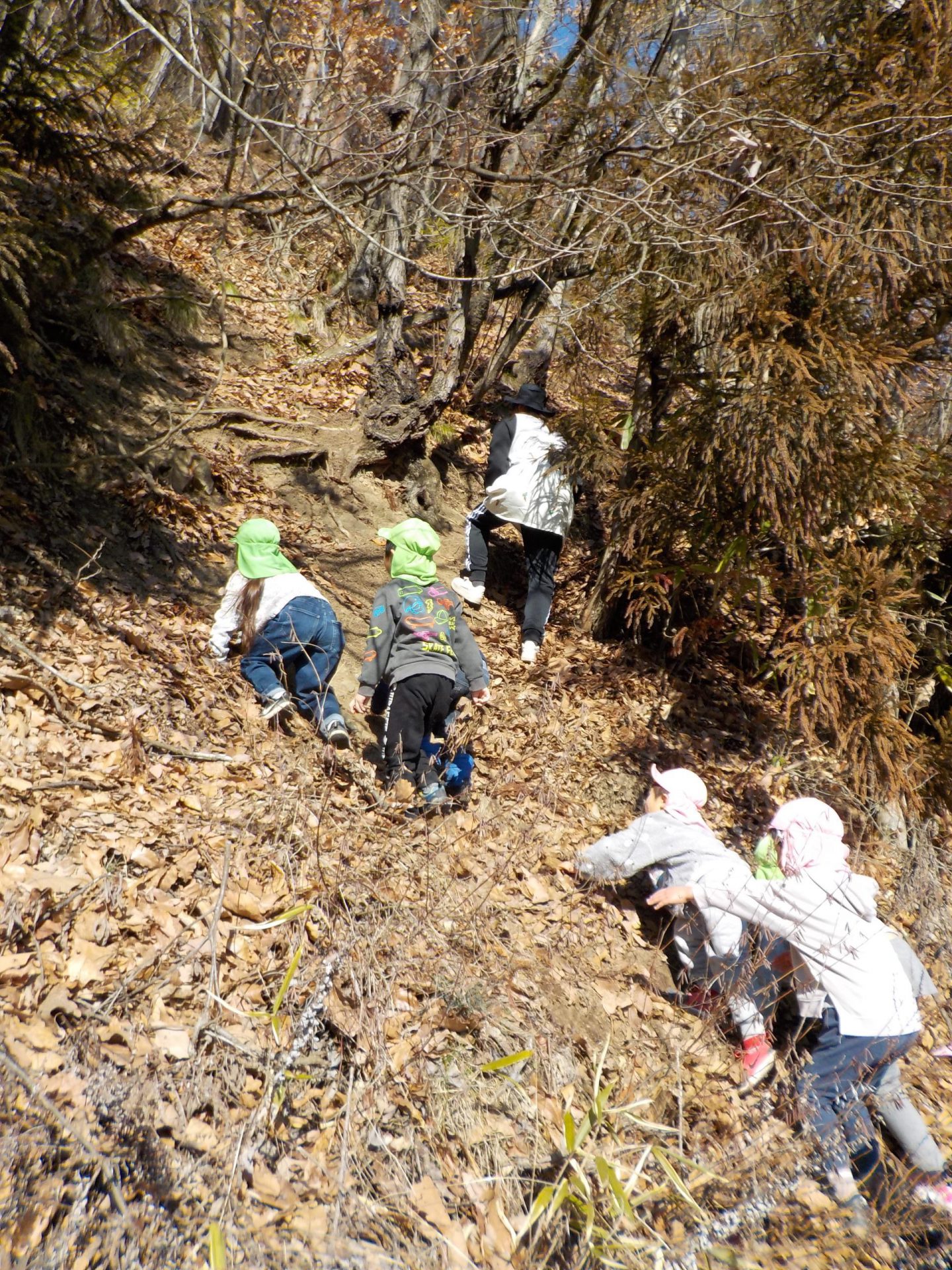 年長さん(黄緑色の帽子)が先頭を切ってグングン登っていくのを追うように、