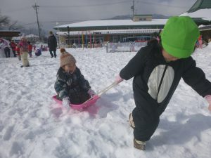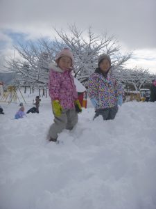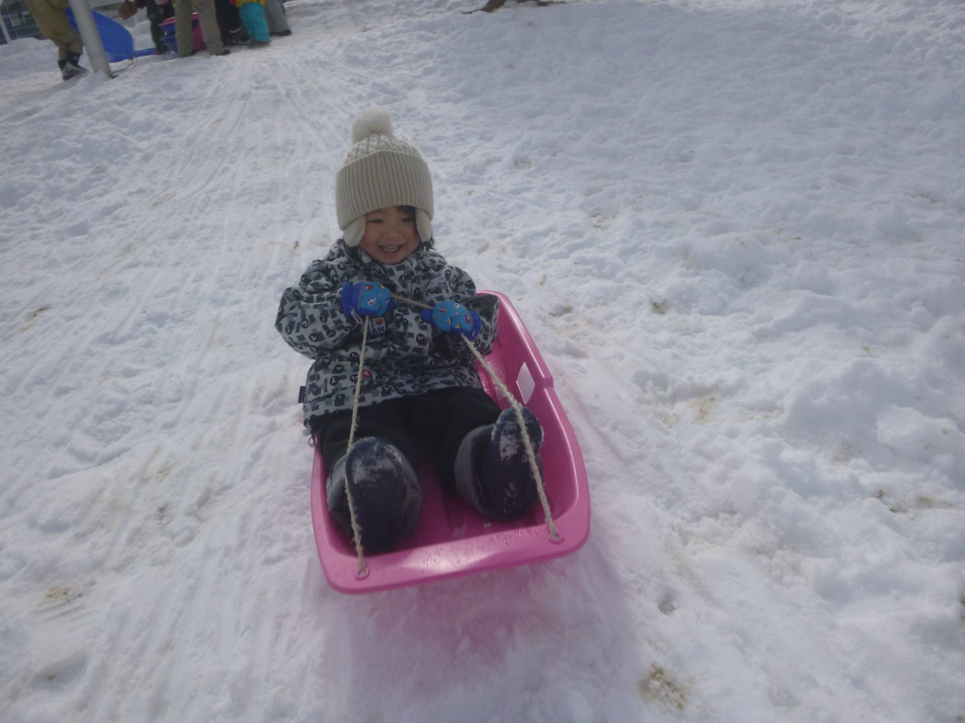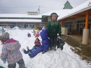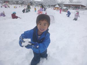 待ちに待った雪が降り、「雪だるまつくりたい!」「そりあそびしたい!」と園庭にとび出しました。